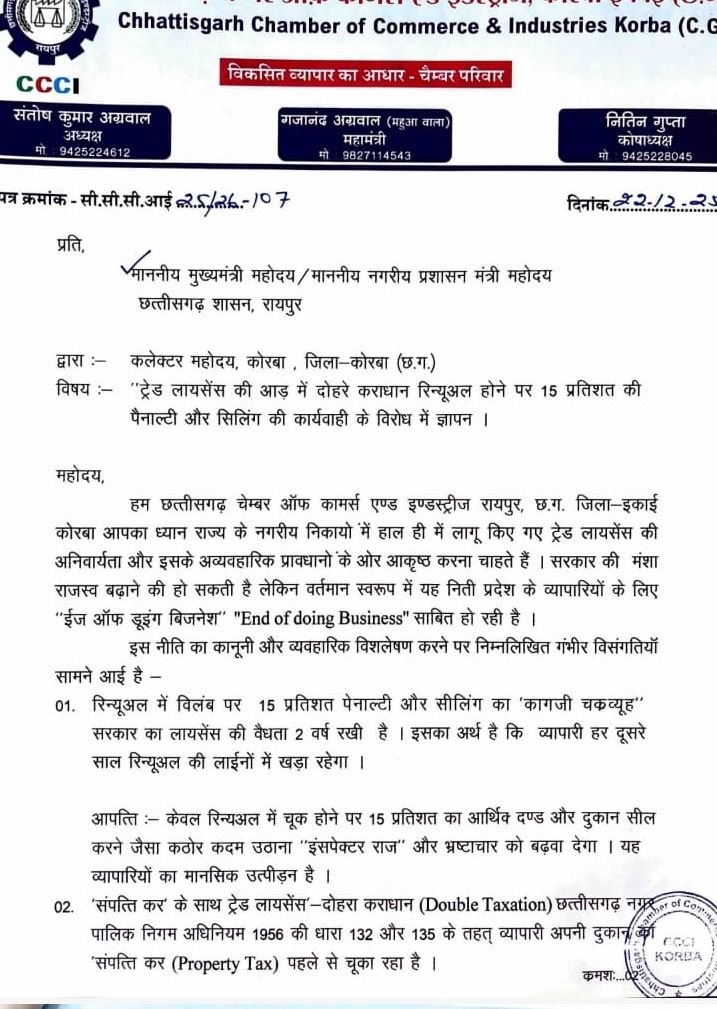 कोरबा। छत्तीसगढ़ चेम्बर ऑफ कॉमर्स एंड इंडस्ट्रीज़, कोरबा द्वारा आज दिनांक 22 दिसंबर 2025 को नवपदस्थ कलेक्टर आईएएस श्री कुणाल दूदावत जी का अभिनंदन एवं स्वागत किया गया। इस अवसर पर चेम्बर प्रतिनिधिमंडल ने शासन द्वारा समस्त व्यापारियों पर ट्रेड लाइसेंस लागू किए जाने के निर्णय का विरोध जताते हुए माननीय मुख्यमंत्री एवं माननीय नगरीय प्रशासन मंत्री के नाम से ज्ञापन सौंपा।