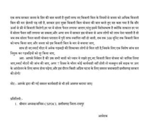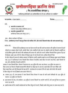 अतः आपसे निवेदन है की उक्त सभी बातों को ध्यान मे रखते हुए, नए बिजली बिल योजना को वापिस लिया जाए, स्मार्ट मीटरों की जांच की जाए, अगर 7 दिवस के भीतर कोई कार्यवाही नहीं होती तो मजबूरन हमें सड़क पर उतर के आंदोलन के लिए बाध्य होना पड़ेगा, और इस दौरान किसी अप्रिय घटना के लिए समस्त जवाबदारी छत्तीसगढ़ सरकार की होगी।