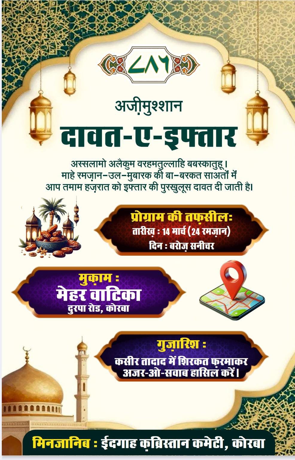 कोरबा। माहे रमजान की बरकतों के बीच शहर में भाईचारे और आपसी सौहार्द को बढ़ावा देने के उद्देश्य से ईदगाह कब्रिस्तान कमेटी कोरबा द्वारा दावत-ए-इफ्तार का आयोजन किया जा रहा है। कमेटी की ओर से सभी जेंट्स और लेडिस को इस आयोजन में शामिल होने के लिए आमंत्रित किया गया है।