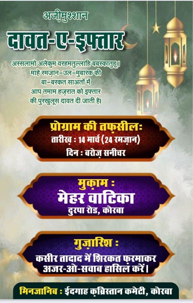 कोरबा में दावत-ए-इफ्तार का आयोजन 14 मार्च को, ईदगाह कब्रिस्तान कमेटी ने शहरवासियों को दिया आमंत्रण