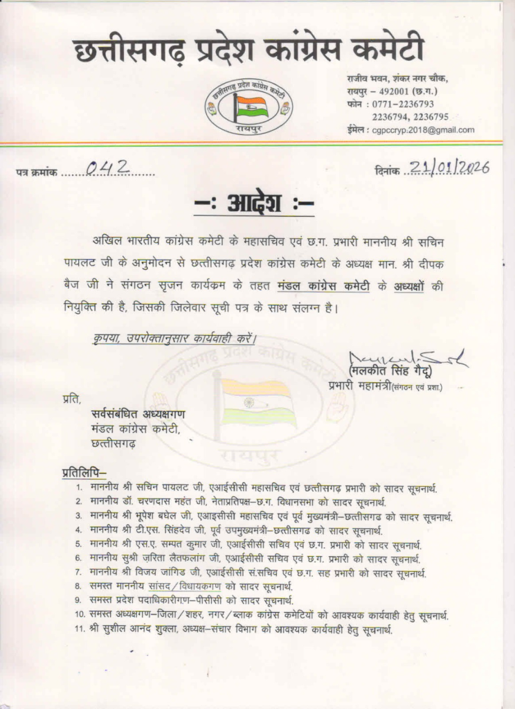 रायपुर, 22 जनवरी। District President List : छत्तीसगढ़ प्रदेश कांग्रेस कमेटी (CGPCC) ने पहली बार कांग्रेस संगठन में मंडल अध्यक्षों की नियुक्ति की है। यह कदम पार्टी के संगठनात्मक ढांचे को मजबूत करने के लिए उठाया गया है। पार्टी ने जिलेवार मंडल अध्यक्षों की सूची जारी कर दी है, जिससे पार्टी कार्यकर्ताओं में एक नई ऊर्जा का संचार होगा और संगठन की स्तर पर मजबूती आएगी। सूची में विभिन्न जिलों के मंडल अध्यक्षों के नामों का ऐलान किया गया है। इस पहल से कांग्रेस की गतिविधियाँ और चुनावी रणनीतियाँ बेहतर तरीके से क्रियान्वित हो सकेंगी, और इससे कार्यकर्ताओं को संगठन से जुड़ने का एक नया अवसर मिलेगा।