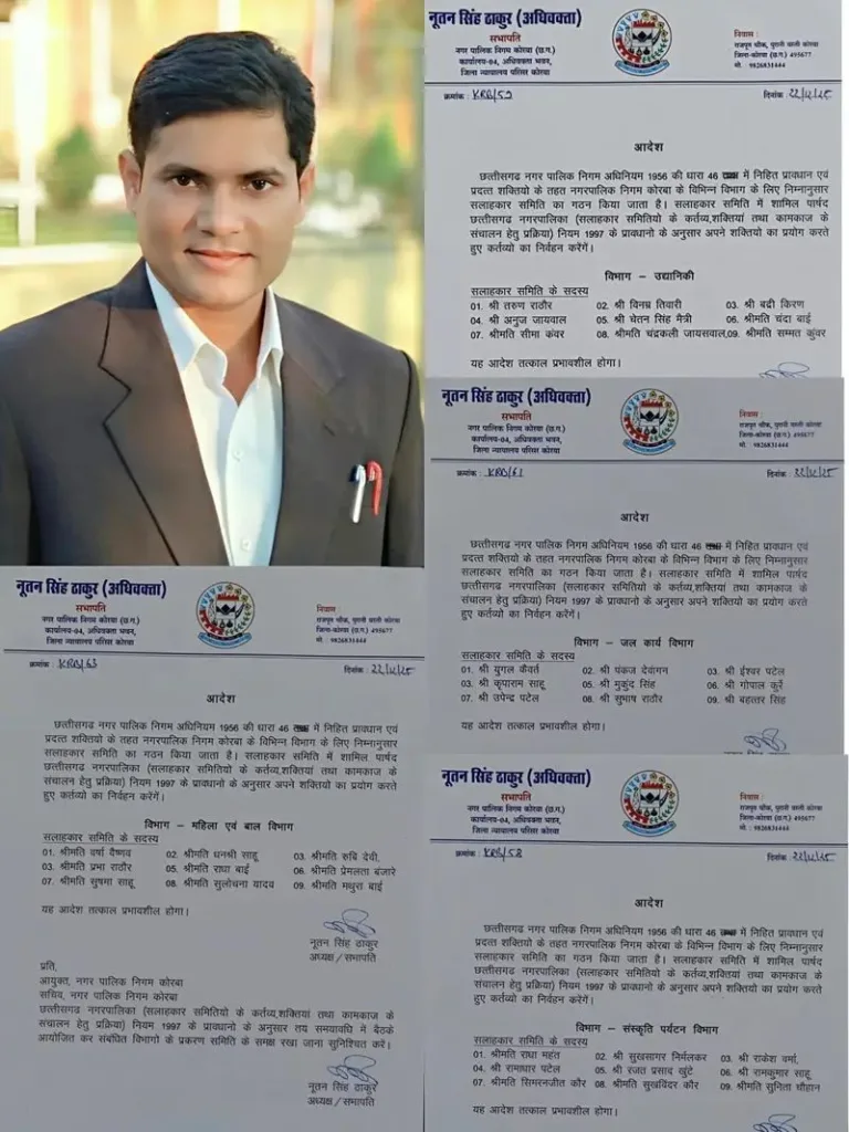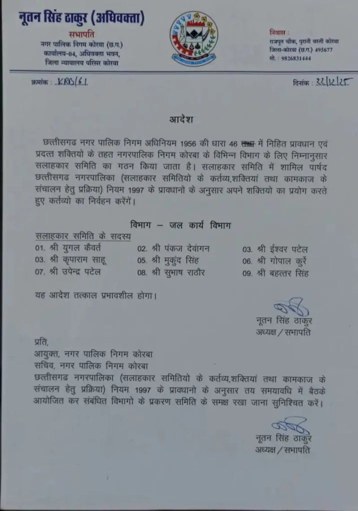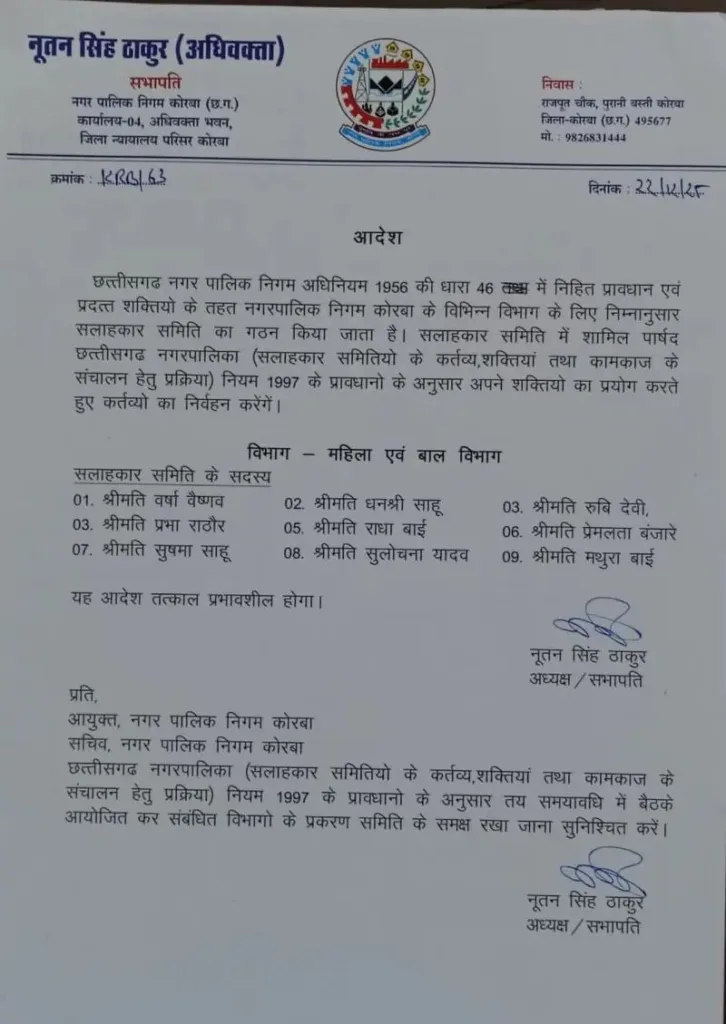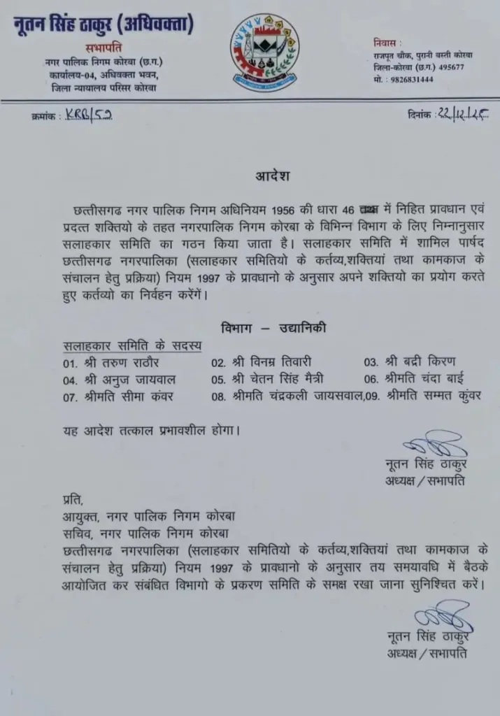 नगर पालिका निगम कोरबा के सभापति व अध्यक्ष नूतन सिंह ठाकुर ने छत्तीसगढ़ नगर निगम अधिनियम के तहत विभिन्न सलाहकार समितियां का गठन किया है। निगम सभापति नूतन सिंह ठाकुर ने इससे पहले भी दो समितियां का गठन किया था, इस बार चार विभागों के लिए गठित समितियां में 36 पार्षदों को स्थान दिया गया है जिसमें भाजपा, कांग्रेस और निर्दलीय पार्षद शामिल हैं। निगम अध्यक्ष नूतनसिंह ठाकुर द्वारा अधिनियम की धारा 46 के तहत आदेश जारी कर उद्यानिकी विभाग के सलाहकार समिति में तरुण राठौर, विनम्र तिवारी, बद्री किरण, अनुज जायसवाल, चेतन सिंह मैत्री, श्रीमती चंदाबाई, श्रीमती सीमा कंवर ,श्रीमती चंद्रकाली जायसवाल, श्रीमती सम्मत कुंवर कों शामिल किया गया है। इसी प्रकार जल कार्य विभाग समिति में युगल कैवर्त , पंकज देवांगन, ईश्वर पटेल, कृपाराम साहू, मुकुंद सिंह कंवर, गोपाल कुर्रे, उपेंद्र पटेल, सुभाष राठौड़ और बहत्तर सिंह शामिल किए गए हैं। महिला एवं बाल विभाग समिति में निगम के महिला पार्षदों को शामिल कर समिति बनाया गया है जिसमें श्रीमती वर्षा वैष्णव, श्रीमती धनश्री साहू, श्रीमती रूबी देवी, श्रीमती प्रभा राठौर, श्रीमती राधाबाई, श्रीमती प्रेमलता बंजारे, श्रीमती सुषमा साहू, श्रीमती सुलोचना यादव, श्रीमती मथुरा बाई को शामिल है। संस्कृति एवं पर्यटन विभाग समिति में श्रीमती राधा महंत, सुखसागर निर्मलकर, राकेश वर्मा, रामाधार पटेल, रजत खुटे, रामकुमार साहू, श्रीमती सिमरनजीत कौर, श्रीमती सुखविंदर कौर, श्रीमती सुनीता चौहान को शामिल करते हुए समिति गठित की गई है।
