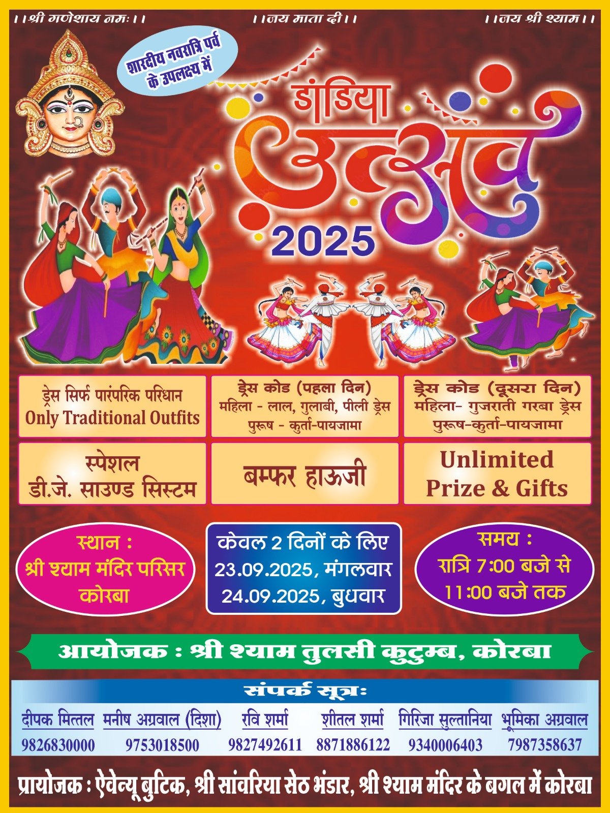 कोरबा। शारदीय नवरात्र पर्व के अवसर पर श्री श्याम तुलसी कुटुम्ब द्वारा भव्य डांडिया उत्सव 2025 का आयोजन किया जा रहा है। यह आयोजन केवल दो दिनों के लिए — 23 और 24 सितंबर को होगा। कार्यक्रम का स्थल श्री श्याम मंदिर परिसर, कोरबा निर्धारित किया गया है।
