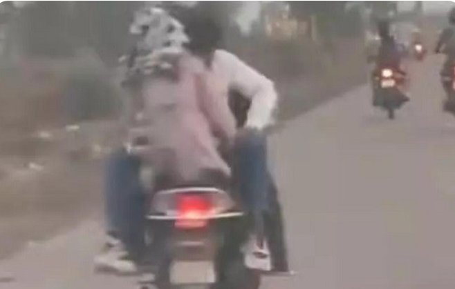हैरानी की बात यह है कि चलती स्कूटी पर कपल रोमांस करता दिख रहा है, जबकि तीसरा युवक वाहन चला रहा है। इस दौरान न तो किसी ने हेलमेट पहन रखा है और न ही ट्रैफिक नियमों का पालन किया जा रहा है। सड़क पर इस तरह की हरकतें न केवल संबंधित युवाओं के लिए, बल्कि अन्य राहगीरों के लिए भी जानलेवा साबित हो सकती हैं। वीडियो में साफ दिख रहा है कि थोड़ी सी चूक बड़ा हादसा बन सकती थी, लेकिन युवाओं को जैसे इसकी कोई परवाह नहीं है। इस घटना ने एक बार फिर युवाओं में बढ़ती लापरवाही और ट्रैफिक नियमों के प्रति उदासीनता को उजागर कर दिया है।