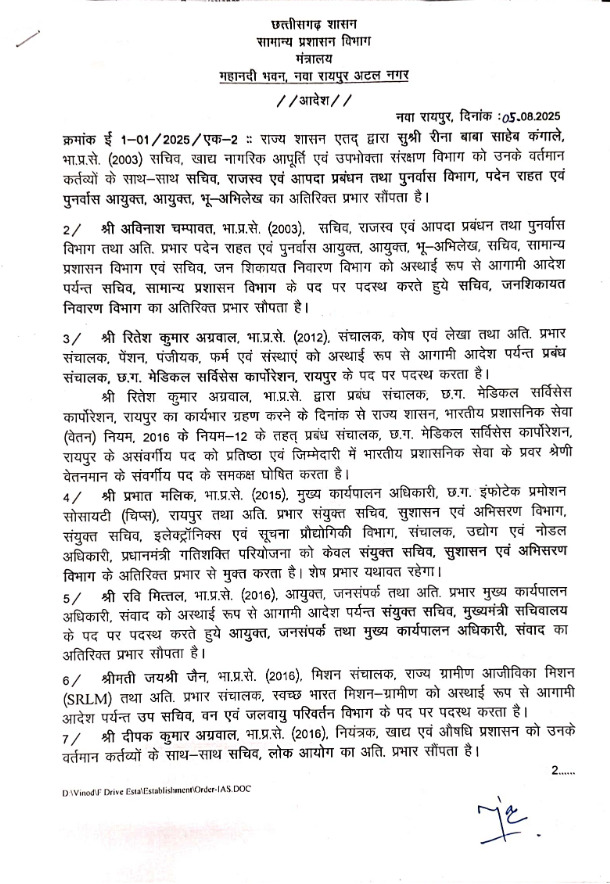 रायपुर, 05 अगस्त। IAS Posting : राज्य सरकर ने बड़ी संख्या में IAS अफसरों की जिम्मेदारी में बदलाव किया है। सीपीआर रवि मित्तल को अहम जिम्मेदारी सौंपते हुए संयुक्त सचिव मुख्यमंत्री सचिवालय बनाया गया है। उनके पास आयुक्त जनसंपर्क व मुख्य कार्यपालन अधिकारी संवाद की उन्हें अतिरिक्त जिम्मेदारी रहेगी।