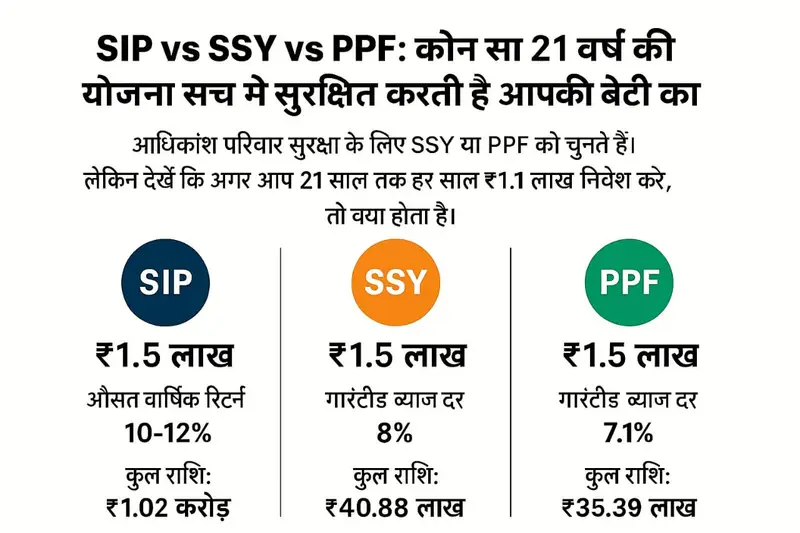 अक्सर परिवार अपनी बेटी के भविष्य को सुरक्षित करने के लिए सुकन्या समृद्धि योजना (SSY) या पब्लिक प्रोविडेंट फंड (PPF) को प्राथमिकता देते हैं, क्योंकि इन्हें सुरक्षित और गारंटीड रिटर्न वाला माना जाता है। लेकिन The Finocrats का कहना है कि केवल सुरक्षा ही नहीं, बल्कि लंबी अवधि में वास्तविक संपत्ति निर्माण पर भी ध्यान देना जरूरी है। अगर हर साल ₹1.5 लाख की राशि 21 वर्षों तक निवेश की जाए, तो तीनों योजनाओं में बड़ा फर्क देखने को मिलता है। जहां PPF और SSY निश्चित ब्याज दरों के साथ लगभग 7.10-8.20% सालाना रिटर्न देते हैं, वहीं सिस्टेमेटिक इन्वेस्टमेंट प्लान (SIP) सही तरीके से चुने गए इक्विटी म्यूचुअल फंड्स में 10-12% या उससे ज्यादा औसत रिटर्न दिला सकता है।