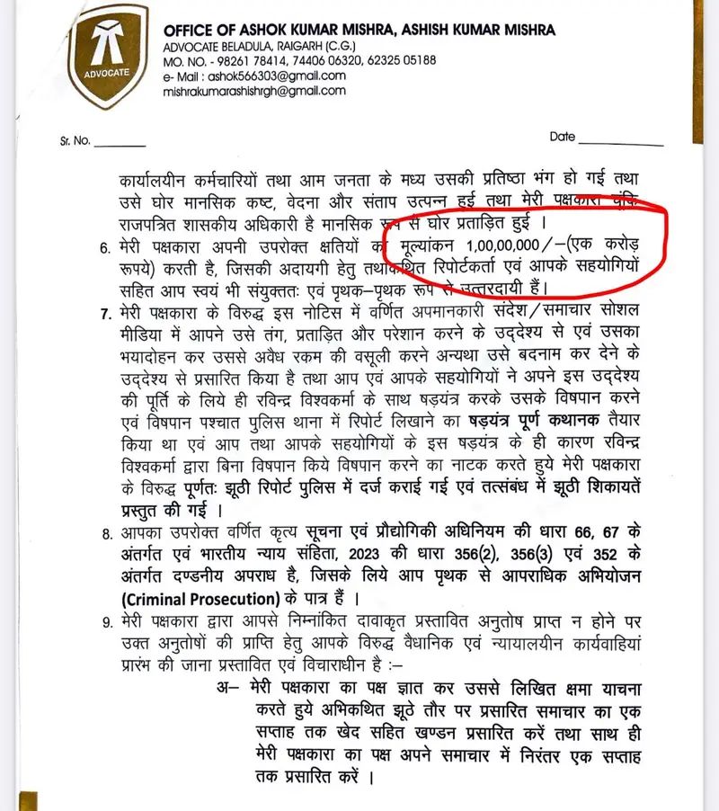 छत्तीसगढ़ में प्रेस की आज़ादी पर बड़ा सवाल खड़ा हो गया है। जशपुर जिले में जनसंपर्क विभाग के एक अधिकारी ने स्थानीय पत्रकारों को कानूनी नोटिस थमा दिया है, जिसमें उन्हें मानहानि का मुकदमा दायर करने और एक-एक करोड़ रुपए हर्जाना वसूलने की चेतावनी दी गई है।