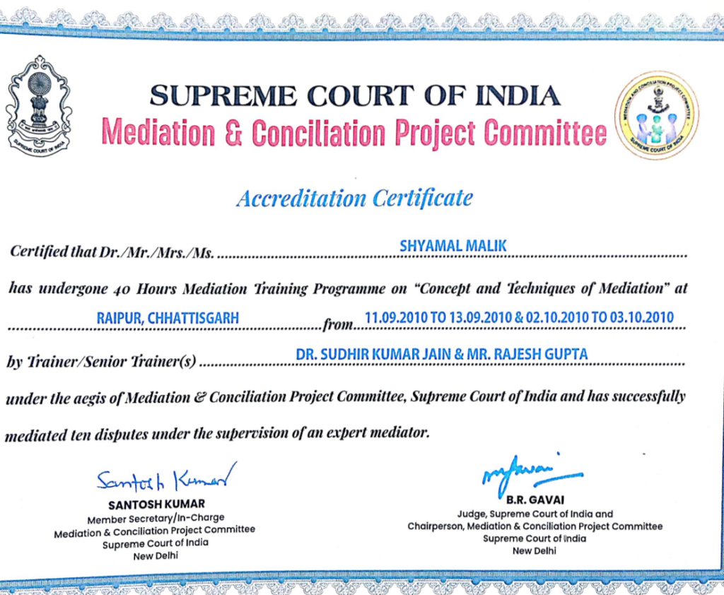 कोरबा।  जिला अधिवक्ता संघ कोरबा के सम्माननीय वरिष्ठतम सदस्य पूर्व सचिव श्री  श्यामल मल्लिक जी को मध्यस्थता एवं सुलह परियोजना समिति उच्चतम न्यायालय भारत (मिडिएशन एवं काउन्सिलैशन प्रोजेक्ट कमेटी सुप्रीम कोर्ट भारत) के द्वारा  मिडिएशन प्रशिक्षण विषय अवधारणा और तकनीक “कॉन्सेप्ट एंड टेक्नगेस आफ मिडिएशन प्रशिक्षण वरिष्ठ प्रशिक्षण श्री.डॉक्टर सुधीर कुमार जैन जी एवं श्री राजेश गुप्ता जी के कुशल मार्गदर्शन एवं प्रशिक्षण में प्रशिक्षण प्राप्त करने उपरांत उत्कृष्ट मिडियेटर के रूप में कार्य करने के संबंध में प्रत्यापन प्रमाण पत्र प्रदान कर सम्मानित किया गया है।