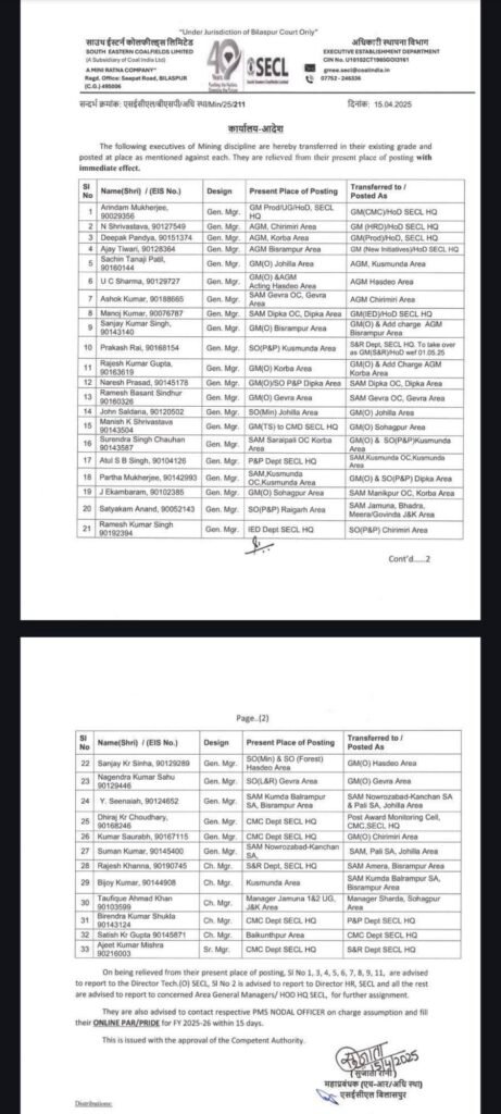 कोरबा। SECL की खदानों में कोयला उठाव के एवज में कमीशन का खेल जहां ऊर्जाधानी से लेकर देश की राजधानी दिल्ली और कोल इंडिया कंपनी में चर्चा का विषय बना हुआ है। इससे ज्यादा चर्चा इस बात की हो रही है कि आखिर केंद्रीय कोयला मंत्री के आगमन पश्चात जारी तबादला सूची में गेवरा,दीपका परियोजना खदान के प्रमुख अधिकारियों का नाम क्यों नहीं है?