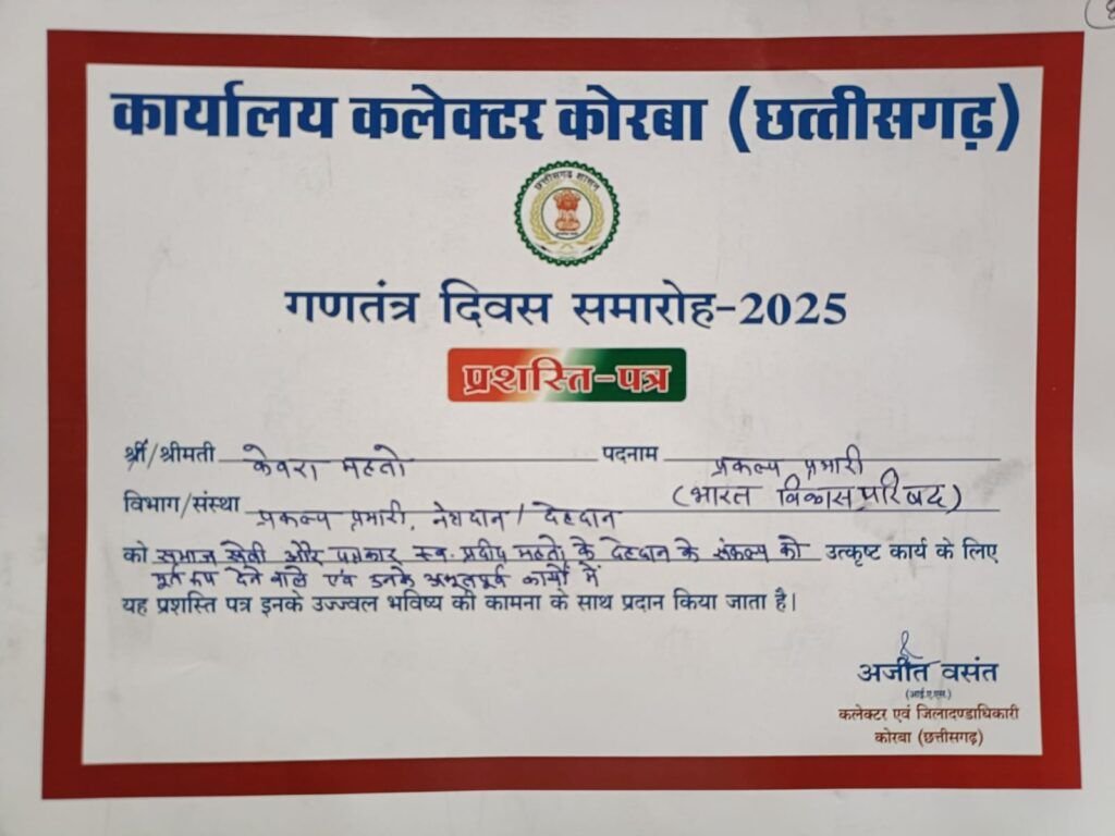 KORBA जिले के प्रथम देहदानी स्व. प्रदीप महतो के परिवार का गणतंत्र दिवस पर जिला प्रशासन द्वारा किया गया सम्मान, केंद्रीय राज्यमंत्री ने दिया प्रशस्ति पत्र