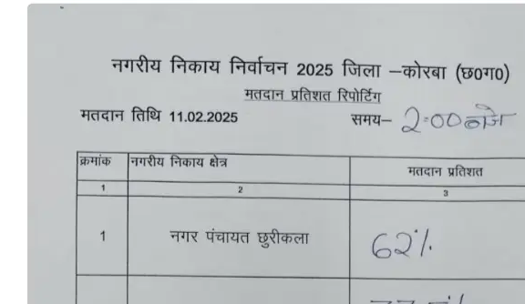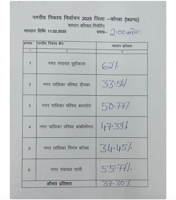 जिले के नगर पालिक निगम कोरबा, नगर पालिका परिषद दीपका, कटघोरा, बांकीमोगरा, नगर पंचायत पाली, नगर पंचायत छुरीकला में दोपहर 2 बजे तक मतदान का प्रतिशत इस प्रकार है:-