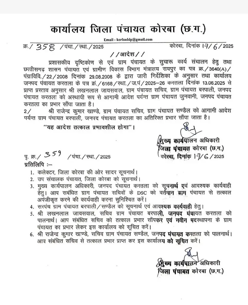 कोरबा। जनपद पंचायत करतला अंतर्गत ग्राम पंचायत बरपाली में 26 मई को सुशासन तिहार शिविर आयोजित की गई थी। शिविर में पंचायत प्रतिनिधि एवं ग्रामीणों द्वारा ग्राम पंचायत बरपाली में पदस्थ सचिव लखन लाल जायसवाल की कार्यशैली, अनियमित उपस्थिति, आचरण एवं कार्य के प्रति लापारवाही बरते जाने की शिकायत की गई थी। श्री जायसवाल को ग्राम पंचायत बरपाली से अन्यत्र स्थानांतरण किये जाने की मांग की गई है। उक्त बिन्दुओं पर विस्तृत जाँच किये जाने जाँच समिति गठित की गई है। जनपद पंचायत करतला मुख्य कार्यपालन अधिकारी द्वारा गठित जांच टीम में उदय सिंह कंवर करारोपण अधिकारी जनपद पंचायत करतला, आलोक गुप्ता सहायक विकास विस्तार अधिकारी और सुकदेव प्रसाद आदित्य लेखापाल को शामिल किया गया है।