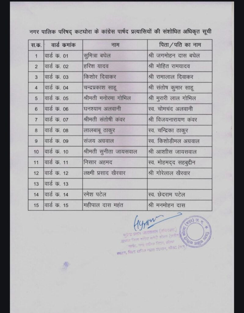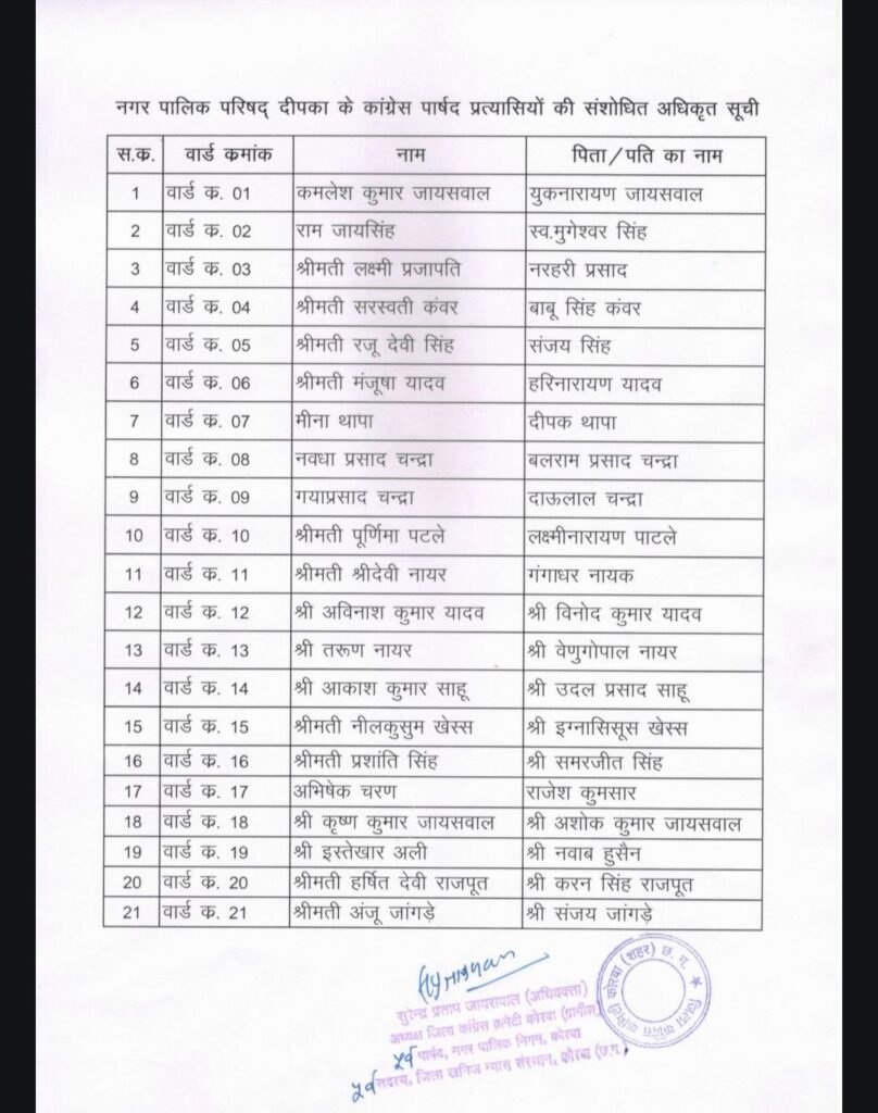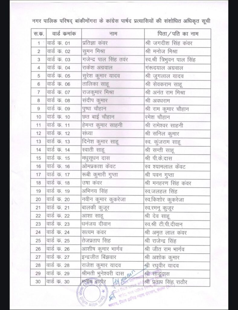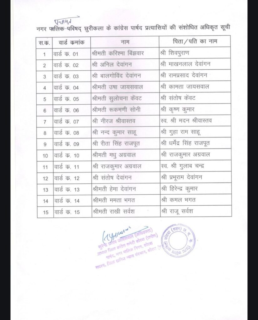 कोरबा। नगरीय निकाय चुनाव को लेकर प्रत्याशियों की जारी सूची में शामिल नाम को लेकर चले आ रहे विरोध-गतिरोध के बीच कांग्रेस ने संशोधित अधिकृत सूची जारी की है। नामांकन वापसी की अंतिम तिथि 31जनवरी से पहले नगर पालिका परिषद और नगर पंचायत के लिए जारी सूची इस प्रकार है:-
