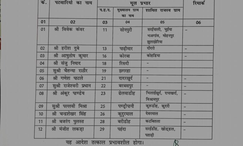 Korba Breaking: SDM ने पटवारियों का किया पोस्टिंग.. बजरंग पुलस्त भेजे गए बरीडीह, देंखे सूची…