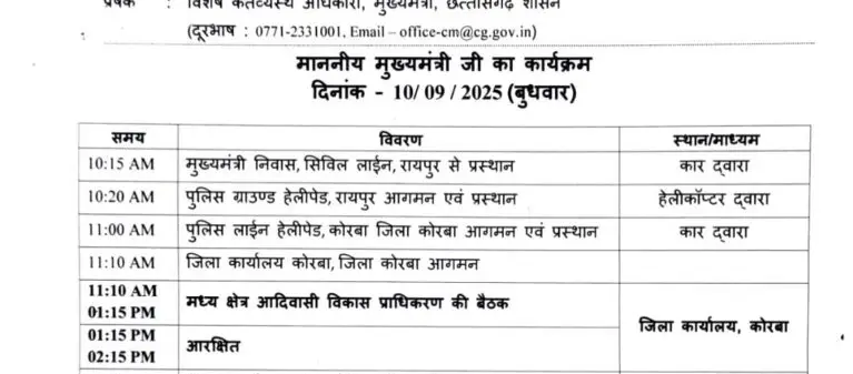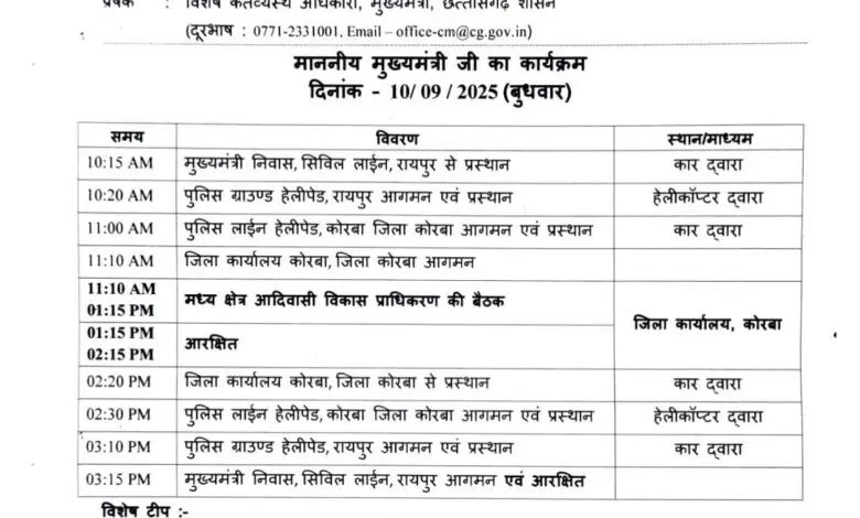 हेलीपैड से सीएम सड़क मार्ग से से कलेक्टर कार्यालय मध्य क्षेत्र विकास प्राधिकरण की बैठक में शामिल होंगे।