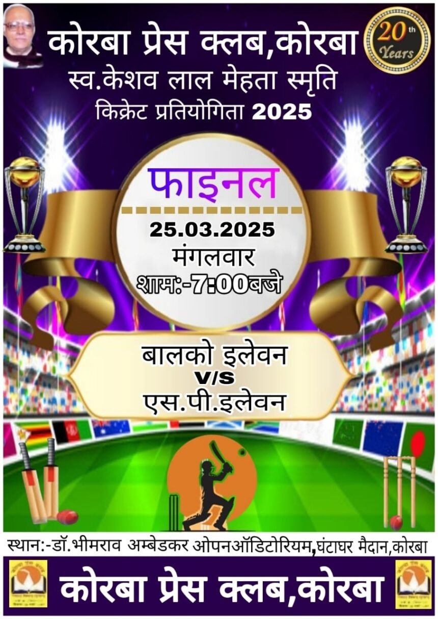 कोरबा। कोरबा प्रेस क्लब द्वारा आयोजित होने वाले क्रिकेट प्रतियोगिता का आयोजन लगातार 20 वें वर्ष भी जारी है। डॉ. भीमराव अंबेडकर ओपन एअर ऑडिटोरियम मैदान में स्व.केशवलाल मेहता क्रिकेट प्रतियोगिता का रोमांच चरम पर है। आज मंगलवार को खिताबी मुकाबला जीतने के लिए बालको-11 और एसपी-11 की टीम मैदान में उतरेगी। दोनों टीमों के बीच केएल मेहता कप पर कब्जा करने के लिए जोरदार मुकाबला होगा। टीमों के खिलाड़ियों ने अपने-अपने शानदार प्रदर्शन की तैयारी कर ली है। शाम 7 बजे से प्रतियोगिता का फाइनल मैच खेला जाएगा।