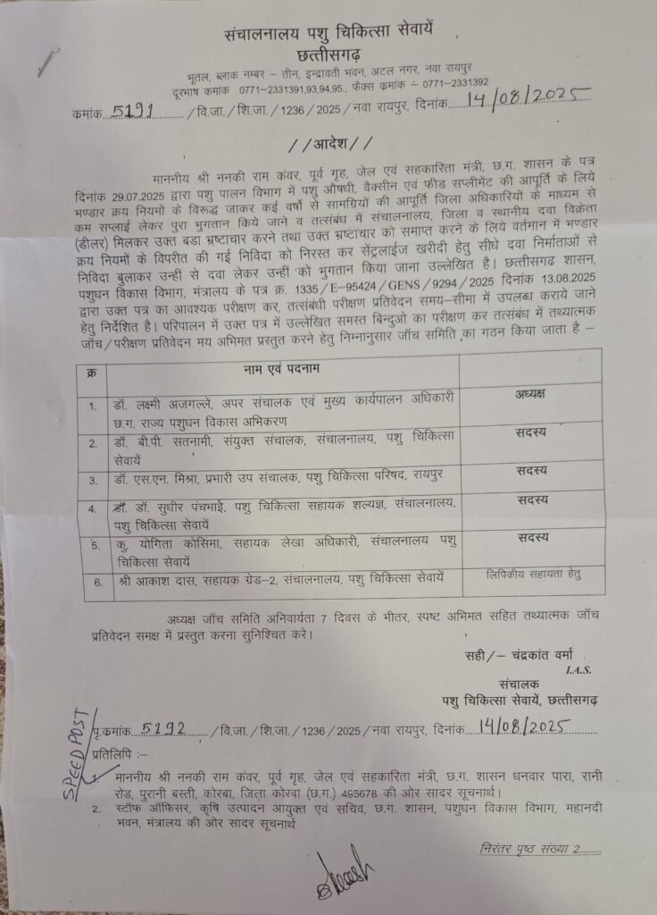 जांच टीम को एक सप्ताह के अंदर जांच रिपोर्ट प्रस्तुत करने के लिए निर्देश जारी किया गया है छत्तीसगढ़ प्रदेश मे पूर्ववर्ती कांग्रेस शासन काल से लेकर आज तक पशु चिकित्सा विभाग में राज्य व जिला स्तर पर पशुओं के उपचार मे उपयोग में आने वाले पशु औषधि की खरीदी के लिए सभी जिला के उपसंचालकों पशु चिकित्सा विभाग के माध्यम से पशु औषधि वैक्सीन, फिट सप्लीमेंट्री इत्यादि की खरीदी भंडार क्रय नियम के विपरीत किया गया है जिसमें 10% पशु औषधि की खरीदी होती है.