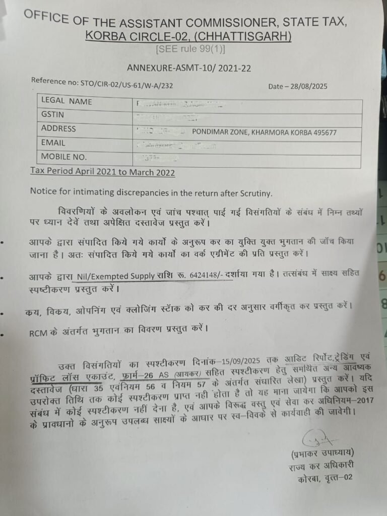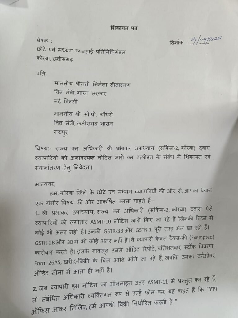 कोरबा जिले के सर्किल-2 में पदस्थ राज्य कर (GST) अधिकारी प्रभाकर उपाध्याय के खिलाफ छोटे व्यापारियों ने गंभीर आरोप लगाए हैं। व्यापारियों का कहना है कि अधिकारी द्वारा अनावश्यक नोटिस (ASMT-10) भेजकर उन्हें परेशान किया जा रहा है, जबकि उनके टैक्स दस्तावेज पूरी तरह से नियमों के अनुरूप हैं।