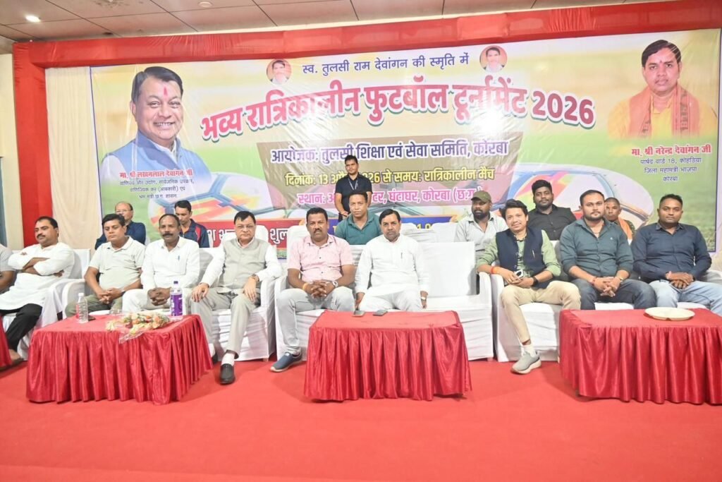 कोरबा : कोरबा में खेल प्रतिभाओं को मिला नया मंच — स्व. तुलसीराम देवांगन स्मृति रात्रिकालीन राज्य स्तरीय फुटबॉल प्रतियोगिता का भव्य शुभारंभ