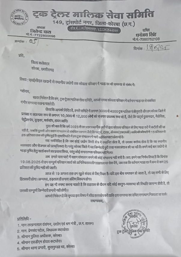 ट्रक ट्रेलर मालिक सेवा समिति ने एसईसीएल से लेकर स्थानीय उद्योगों तक कोयला परिवहन में भाड़ा वृद्धि की मांग को लेकर जिला कलेक्टर को ज्ञापन सौंपा है। समिति ने स्पष्ट कहा है कि यदि उनकी मांगों पर ध्यान नहीं दिया गया, तो 19 अगस्त के बाद से अनिश्चितकालीन हड़ताल की जाएगी।
