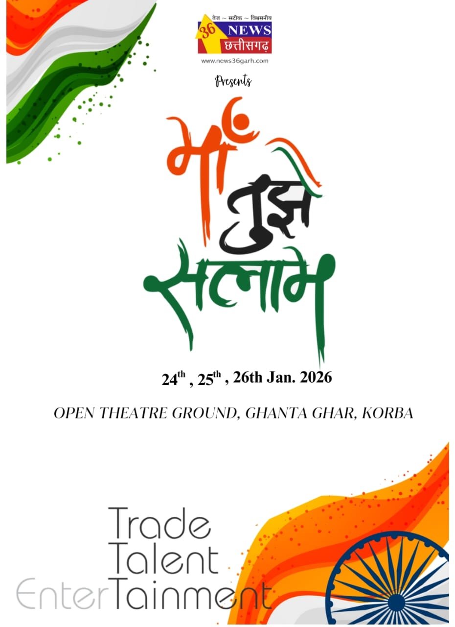 कोरबा। कोरबा आज से इतिहास के एक स्वर्णिम अध्याय में प्रवेश करने जा रहा है, जिसकी गूंज आने वाले वर्षों तक शहरवासियों के मन-मस्तिष्क में बनी रहेगी। गणतंत्र दिवस के पावन अवसर पर आयोजित होने वाला बहुप्रतीक्षित और प्रतिष्ठित आयोजन ‘मां तुझे सलाम’ आज से भव्य रूप में प्रारंभ हो गया है। आगामी तीन दिनों तक ओपन थिएटर, घंटाघर मैदान राष्ट्रभक्ति, संस्कृति, युवा ऊर्जा और व्यापारिक गतिविधियों का केंद्र बना रहेगा।