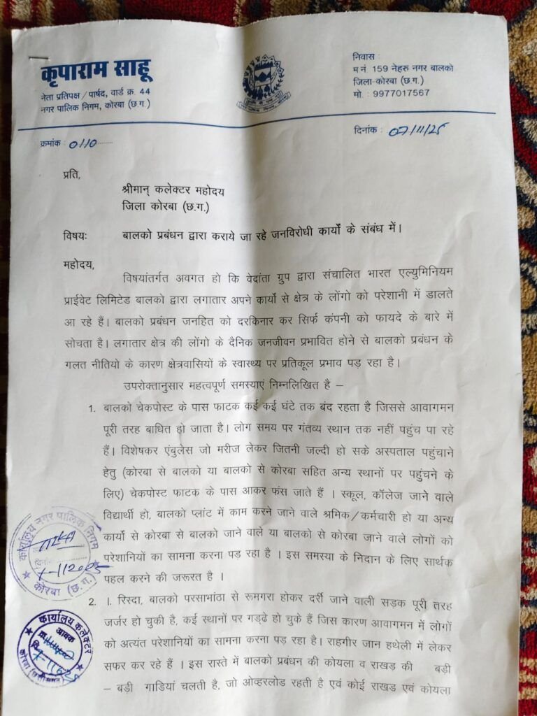 कोरबा। नगर पालिका निगम कोरबा के नेता प्रतिपक्ष कृपाराम साहू ने बालको प्रबंधन के खिलाफ मोर्चा खोलते हुए कलेक्टर को ज्ञापन सौपा है जिसमें उन्होंने बालको प्रबंधन पर कई गंभीर आरोप लगाए हैं। कृपाराम साहू ने कहा कि चेक पोस्ट के पास बालको का एक रेलवे क्रॉसिंग है जहां पर आए दिन लोग जाम में फंस रहे हैं । घंटो तक फाटक बंद रहता है जिससे लोग परेशान होते हैं । लेकिन बालको प्रबंधन का कोई ध्यान नही है।