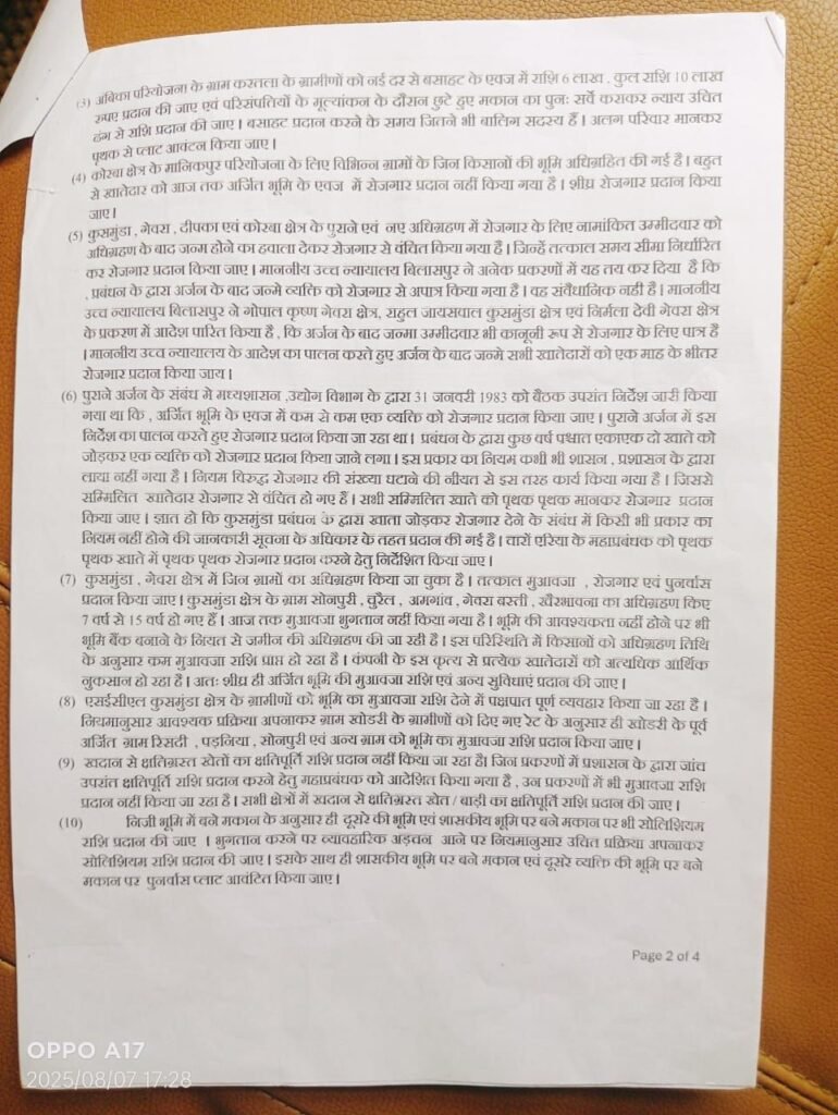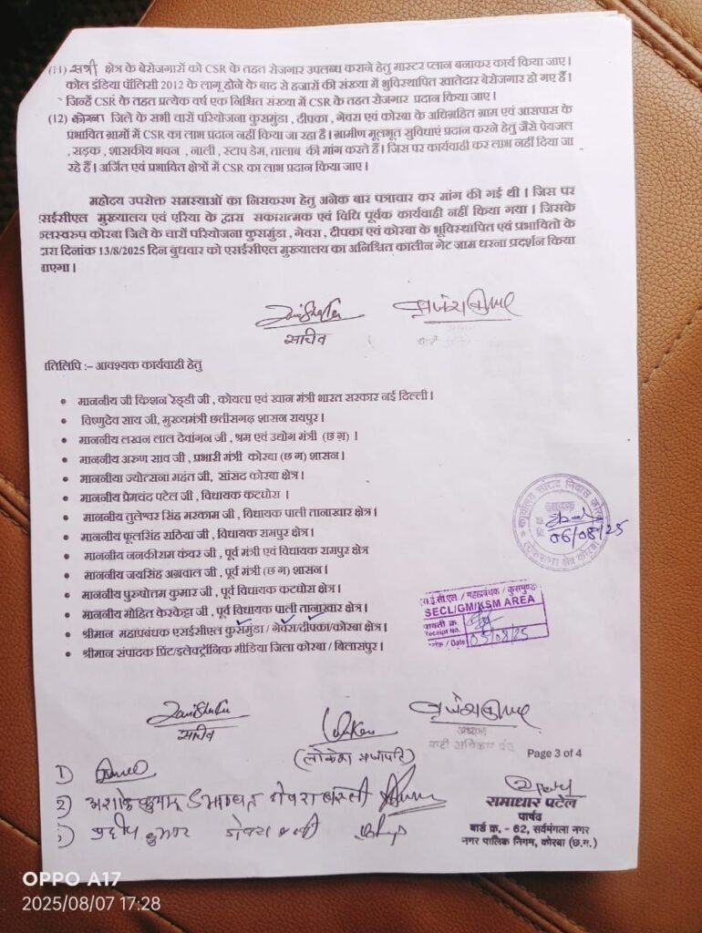 कोरबा जिले के चारों परियोजना के भूविस्थापित एवं प्रभावित जिन्होंने कोयला उत्खनन हेतु अपनी पुरखों की जमीन एसईसीएल कंपनी को दी है । कई दशक गुजर जाने के बाद भी आज रोजगार , मुआवजा , पुनर्वास एवं मूलभूत सुविधाओं के लिए दर-दर की ठोकरे खा रहे हैं । समस्याओं की निराकरण हेतु अनेक बार निवेदन कर चुके है , परंतु झूठा आश्वासन देकर गुमराह किया जा रहा है । जिसके कारण चारों क्षेत्र के भूविस्थापित अत्यधिक व्यथित हैं । अर्जित भूमि के एवज में रोजगार , मुआवजा एवं पुनर्वास देने हेतु शासन एवं प्रशासन के द्वारा निर्देश दिए गए हैं । उन निर्देशों का एसईसीएल के द्वारा पालन नहीं किया जा रहा है । जिसके कारण बार-बार खदान में हड़ताल की स्थिति निर्मित हो रही है । जिसके कारण उत्पादन क्षमता में कमी आ रही है । जिसके लिए प्रबंधन के अधिकारी जवाबदार हैं ।