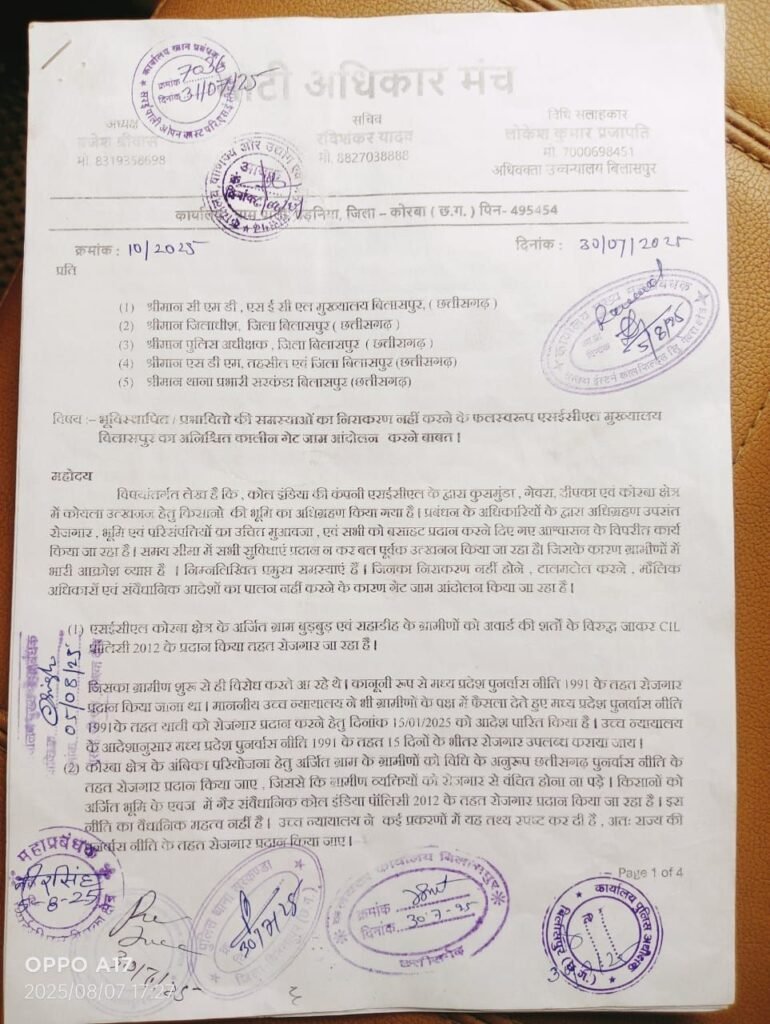 माटी अधिकार मंच के अध्यक्ष ब्रजेश कुमार ने बताया कि संगठन के द्वारा भूविस्थापितों , प्रभावितों के हित में 13 बिंदुओं की समस्याओं पर तत्काल कार्यवाही करने की मांग की गई है । समस्याओं के निराकरण हेतु 13 अगस्त को एसईसीएल मुख्यालय बिलासपुर में गेट जाम आंदोलन किया जाएगा ।