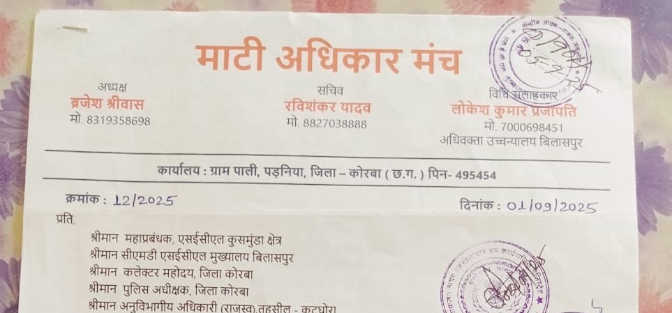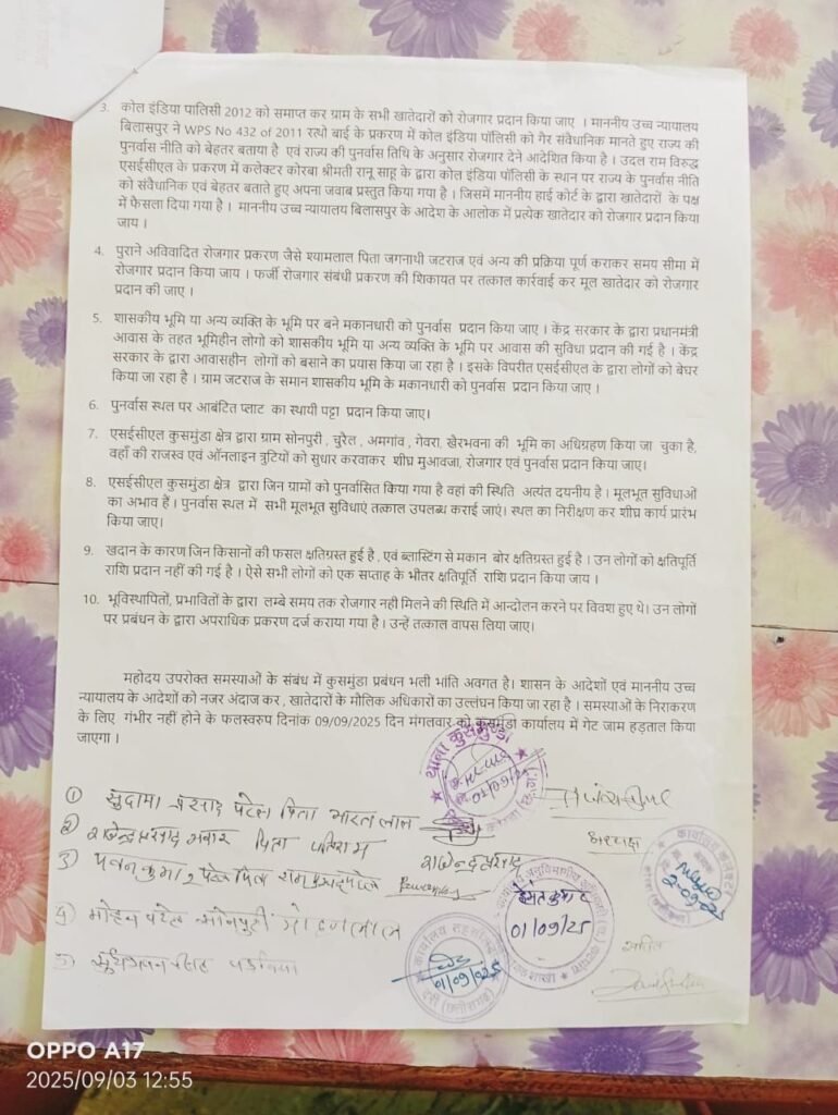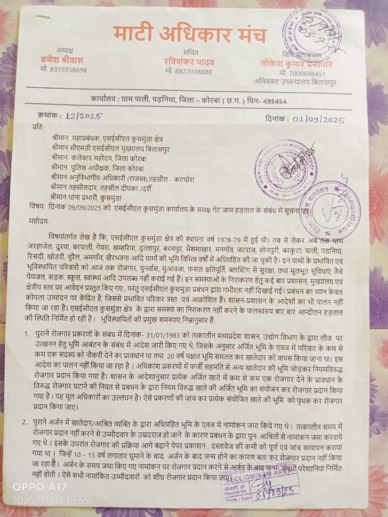 माटी अधिकार मंच के द्वारा भूविस्थापितों प्रभावितों की समस्याओं के संबंध में 10 सूत्रीय मांग पत्र एसईसीएल महाप्रबंधक कुसमुंडा को सौंपी गई है । जिसके संबंध में 9 सितंबर को एसईसीएल कुसमुंडा महाप्रबंधक कार्यालय का गेट जाम हड़ताल किया जाएगा । जिसमें पुराने अर्जन एवं नए अर्जन से प्रभावित ग्रामीण उपस्थित रहेंगे ।