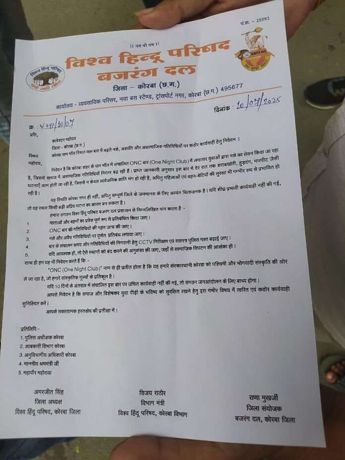 कोरबा : कोरबा जिले में नशाखोरी के बढ़ते मामलो पर कार्यवाही की मांग लेकर विश्व हिन्दु परिषद, बजरंग दल द्वारा पुलिस अधीक्षक कार्यालय में ज्ञापन सौपा गया है,बजरंगदल के जिला संयोजक राणा मुख़र्जी ने बताया कि पाम मॉल मे संचालित onc बार से क्षेत्र मे नशाखोरी के मामले बढ़ रहे है,