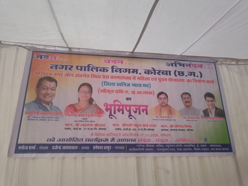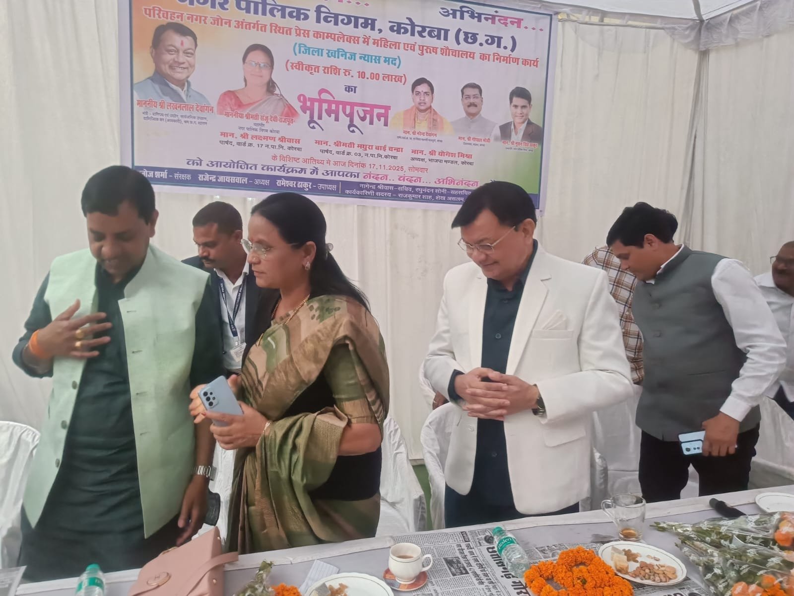 कोरबा। विधानसभा के अंतर्गत शहर के विकास कार्यों को आगे बढ़ाते हुए टीपी नगर स्थित प्रेस कॉम्प्लेक्स में महिला एवं पुरुष शौचालय निर्माण कार्य का भूमिपूजन आज संपन्न हुआ। यह निर्माण जिला खनिज न्यास मद (DMF) से स्वीकृत कुल 10 लाख रुपये की लागत से किया जा रहा है।