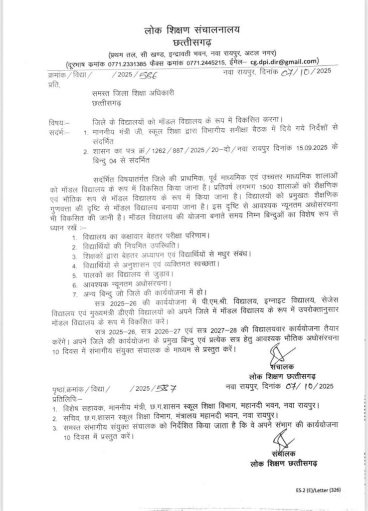छत्तीसगढ़ में शिक्षा का नया अध्याय — 1500 स्कूल बनेंगे मॉडल विद्यालय! लोक शिक्षण संचालनालय ने सभी डीईओ जारी किया पत्र…