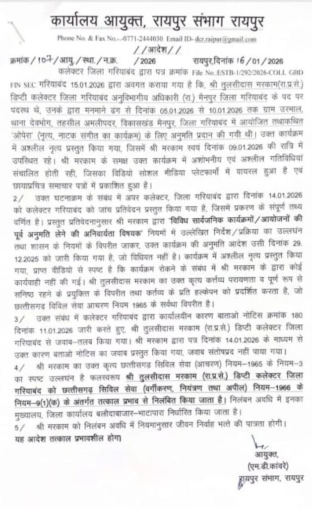 गरियाबंद, 01 फरवरी। Obscene Dance : छत्तीसगढ़ में राजनीतिक हलचल मचाने वाले उरमाल ओपेरा मामले में निलंबित एसडीएम तुलसीदास मरकाम को हाईकोर्ट से अंतरिम राहत मिली है। हाईकोर्ट ने कमिश्नर द्वारा जारी निलंबन आदेश पर रोक लगाते हुए राज्य सरकार को 10 दिन के भीतर अपना पक्ष रखने का निर्देश दिया है।