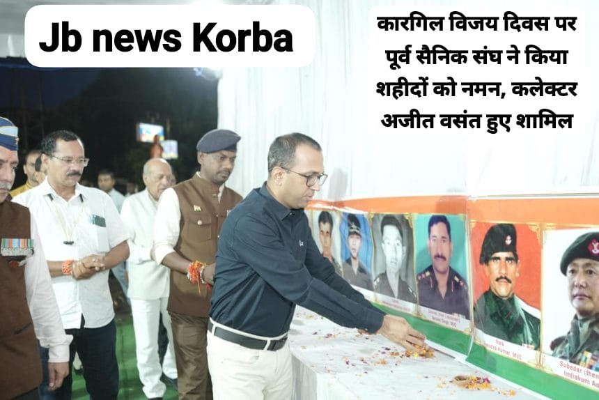 कोरबा। कारगिल विजय दिवस के अवसर पर आज कोरबा में सुभाष चौक निहारिका में पूर्व सैनिक संघ द्वारा कार्यक्रम का आयोजन कर देश के शहीद जवानों को श्रद्धांजलि दी गई। दीप प्रज्वलन कर पुष्प अर्पित किए गए और दो मिनट का मौन रखकर वीर शहीदों को याद किया गया।