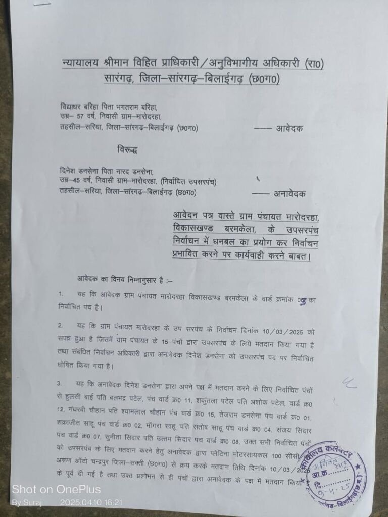 बरमकेला, रायगढ़।* जनपद पंचायत बरमकेला अंतर्गत ग्राम पंचायत मारोदरहा में उप सरपंच पद को लेकर उठे विवाद ने न केवल पंचायत की साख पर सवाल खड़े कर दिए हैं, बल्कि पंचायती राज व्यवस्था की जड़ों को भी झकझोर कर रख दिया है। लोकतंत्र की बुनियाद माने जाने वाले ग्राम स्तर पर यदि वोट की कीमत एक ‘प्लेटिना मोटरसाइकिल’ हो जाए, तो यह शासन व्यवस्था के लिए बेहद चिंताजनक संकेत है।