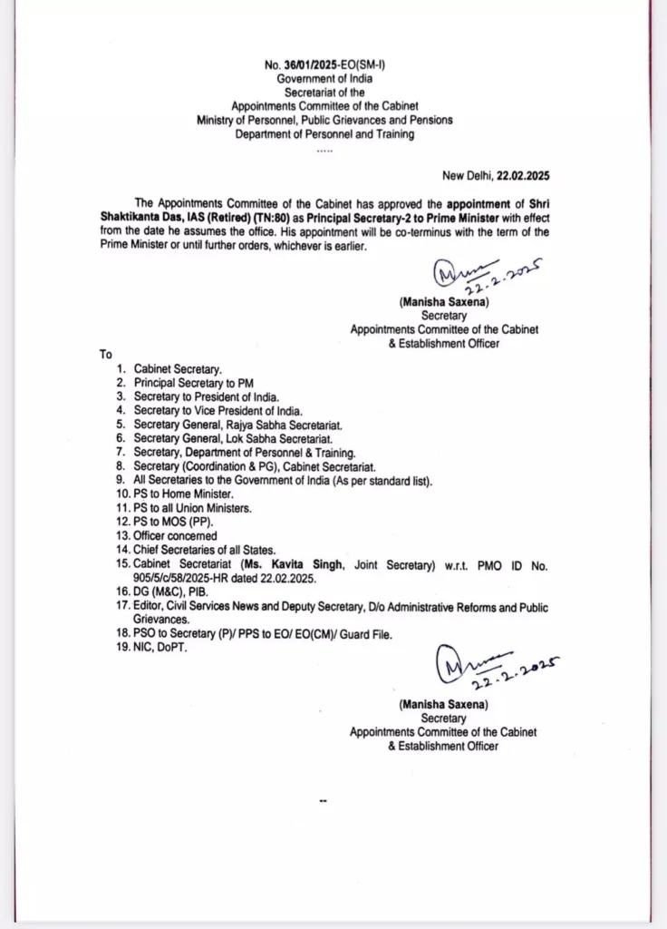 दिल्ली। शक्तिकांता दास PM मोदी के प्रिंसिपल सेक्रेटरी नियुक्त हुए। शक्तिकांत दास (जन्म 26 फरवरी 1957) एक भारतीय नौकरशाह अधिकारी हैं, जिन्होंने भारतीय रिजर्व बैंक (RBI) के 25वें गवर्नर के रूप में कार्य किया। वे पहले पंद्रहवें वित्त आयोग के सदस्य और G20 में भारत के शेरपा थे। दास तमिलनाडु कैडर के 1980 बैच के भारतीय प्रशासनिक सेवा (IAS) के सेवानिवृत्त अधिकारी हैं ।