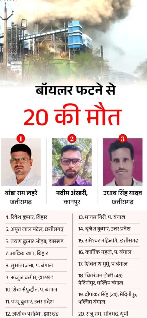 इस भयावह ब्लास्ट में अब तक 20 श्रमिकों की मौत की पुष्टि हो चुकी है। हादसे में कुल 36 लोग प्रभावित हुए, जिनमें से 16 घायल अब भी रायगढ़ के जिंदल फोर्टिस, बालाजी मेट्रो और रायपुर के निजी अस्पतालों में जिंदगी और मौत के बीच झुलस रहे हैं। मृतकों में छत्तीसगढ़ के अलावा उत्तर प्रदेश, बिहार, झारखंड और पश्चिम बंगाल के मजदूर शामिल हैं।