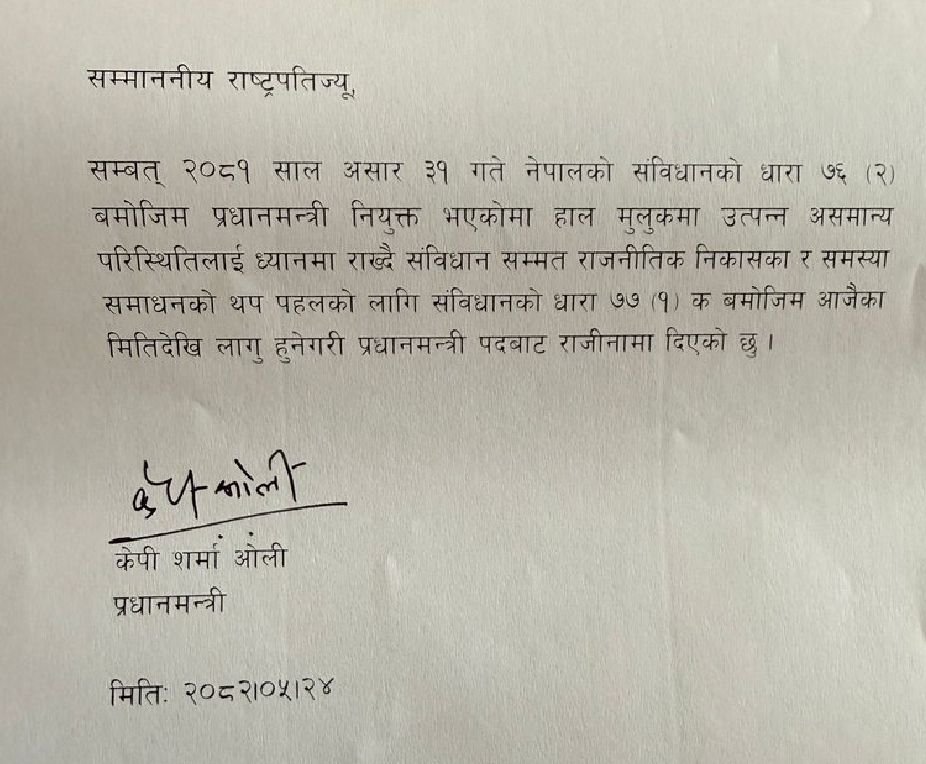 ओली ने अपने इस्तीफे में कहा कि उन्होंने यह कदम देश की “असाधारण स्थिति” को देखते हुए और संवैधानिक तरीके से समस्याओं का समाधान खोजने के लिए उठाया है।