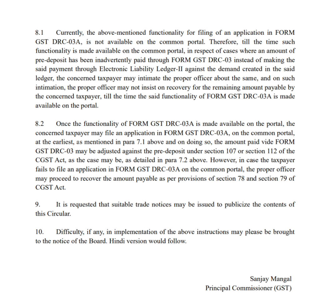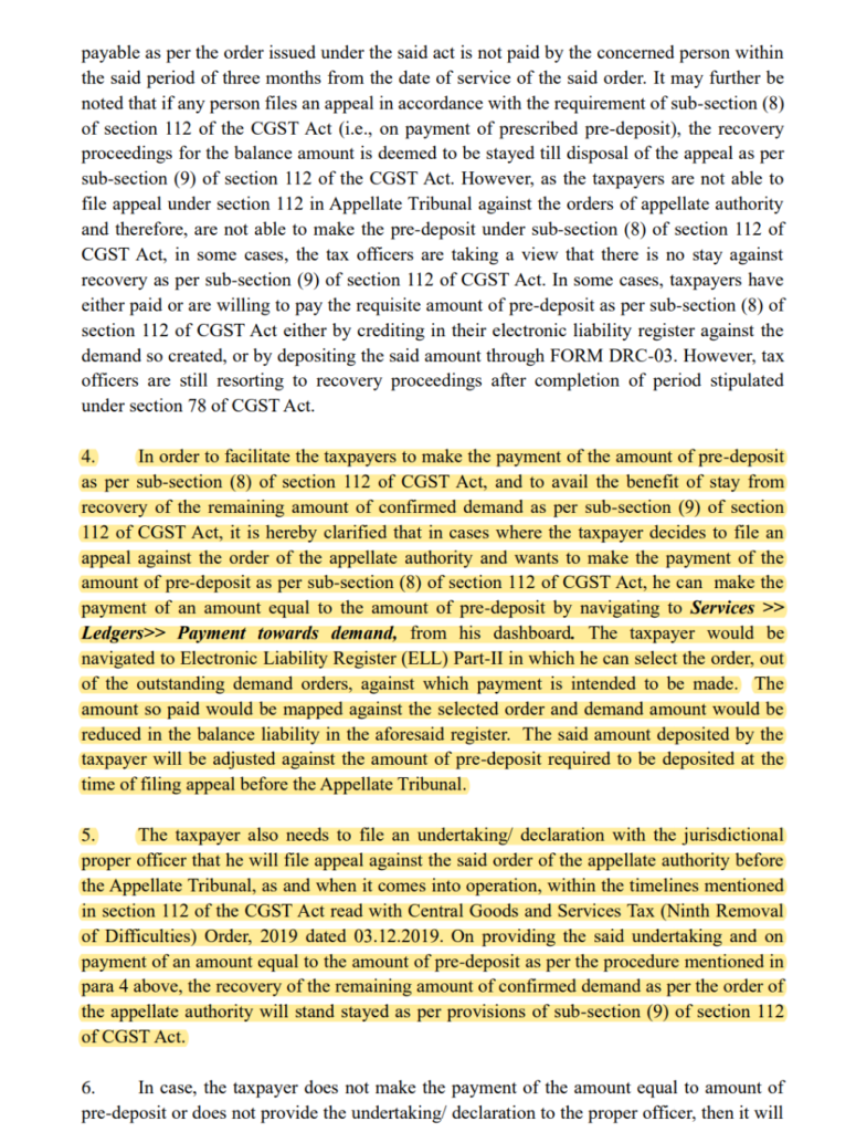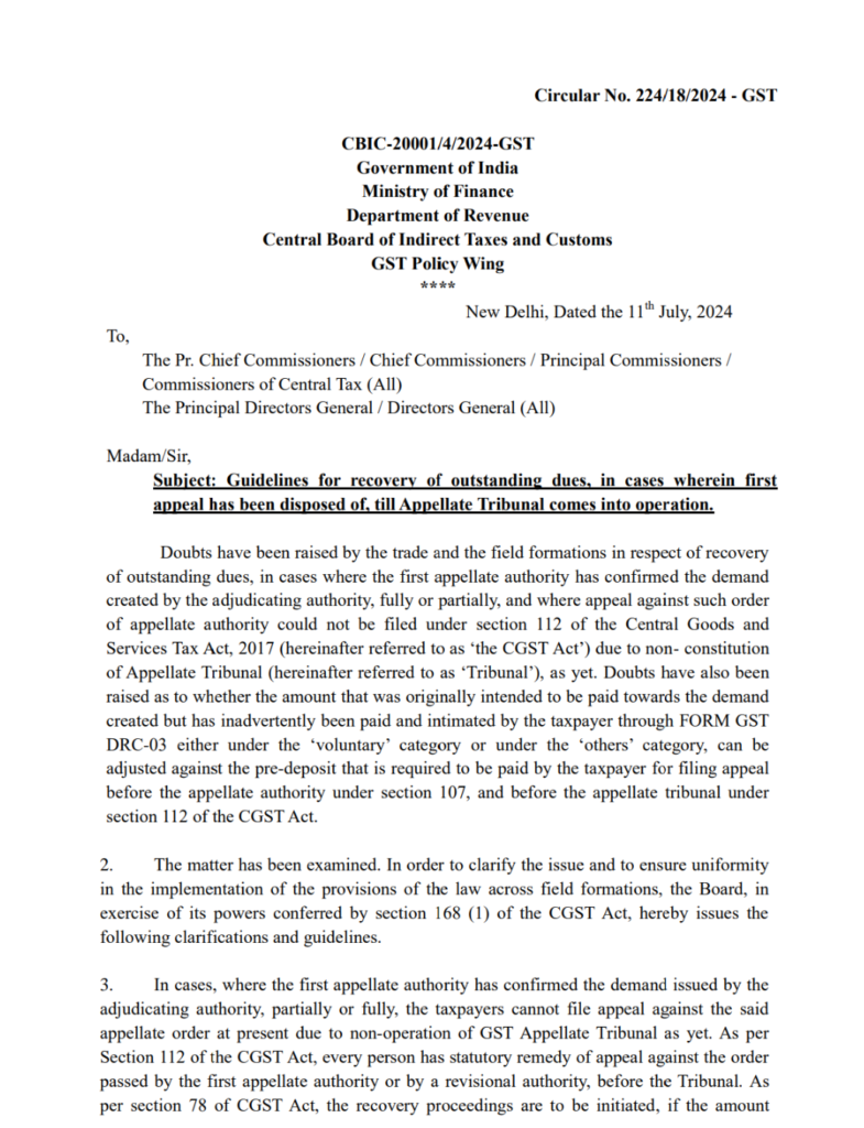 व्यापारियों ने इस मामले में CBIC Circular No. 224/18/2024-GST (दिनांक 11 जुलाई 2024) का हवाला दिया है। सर्कुलर में उल्लेख है कि यदि प्रथम अपीलीय प्राधिकारी का आदेश हो चुका है और GST अपीलीय अधिकरण (Tribunal) अभी तक कार्यरत नहीं है, तो करदाता द्वारा धारा 112 के अंतर्गत निर्धारित प्री-डिपॉजिट जमा करने और संबंधित अधिकारी को अंडरटेकिंग देने के बाद शेष मांग की रिकवरी को स्थगित माना जा सकता है।