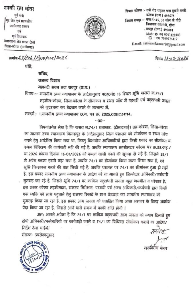 बताया जा रहा है कि पूर्ववर्ती सरकार के दौरान स्थानीय निवासियों को जमीन का पट्टा दिया गया था। खसरा नंबर 74/1 की स्थल जांच और सीमांकन को लेकर उच्च न्यायालय बिलासपुर ने जिला प्रशासन को निर्देश जारी किए थे। इसके बावजूद आरोप है कि तहसीलदार कोरबा द्वारा बिना जांच और सीमांकन किए ही ग्रामीणों को कब्जा खाली करने का नोटिस थमा दिया गया। राजस्व विभाग के कुछ अधिकारियों एवं पटवारियों पर दस्तावेजों में हेरफेर कर न्यायालय को गुमराह करने के आरोप भी लगाए गए हैं। ननकीराम कंवर ने मुख्य सचिव एवं राजस्व सचिव को पत्र लिखकर हाईकोर्ट के आदेश का पालन सुनिश्चित करने और दोषी अधिकारियों के खिलाफ कड़ी कार्रवाई की मांग की है। उन्होंने कहा कि प्रशासनिक रवैये से जनता में आक्रोश बढ़ रहा है और यदि समय रहते न्याय नहीं मिला तो आंदोलन तेज किया जाएगा। विधानसभा सत्र से पहले यह मामला राजनीतिक रूप से और गरमा सकता है।