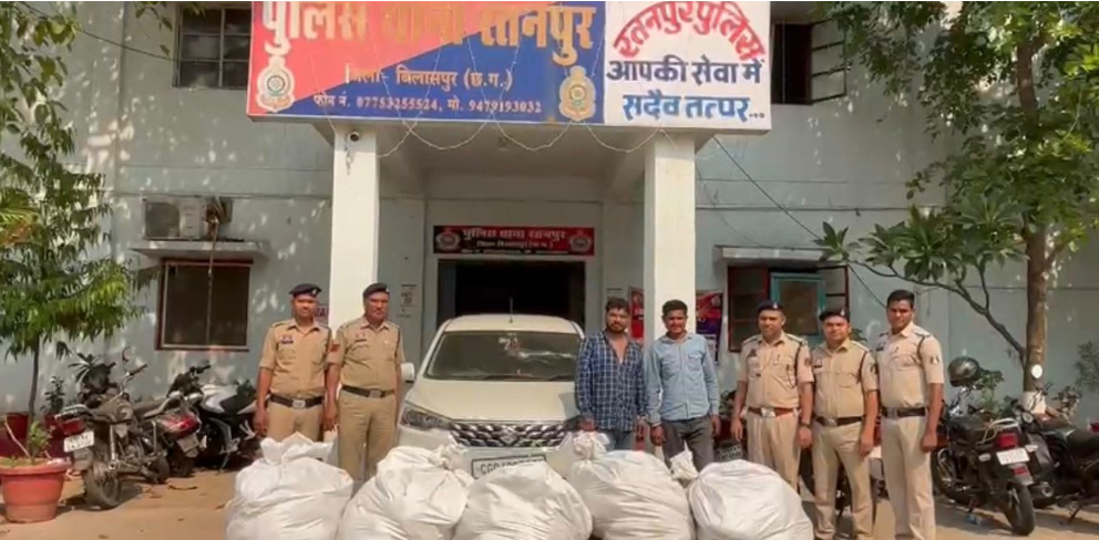 बिलासपुर, 18 अप्रैल 2026 । जिले के रतनपुर थाना क्षेत्र में पुलिस ने अवैध मादक पदार्थ के खिलाफ बड़ी कार्रवाई करते हुए 245 किलोग्राम गांजा जब्त किया है। इस मामले में दो आरोपियों को गिरफ्तार किया गया है, जो मध्यप्रदेश के रहने वाले हैं। जब्त गांजे की कीमत लगभग 1 करोड़ 22 लाख रुपये आंकी गई है। इसके अलावा गांजा परिवहन में प्रयुक्त मारुति अर्टिगा कार, मोबाइल फोन और फर्जी नंबर प्लेट समेत कुल जब्ती की कीमत 1 करोड़ 30 लाख 56 हजार रुपये बताई गई है।