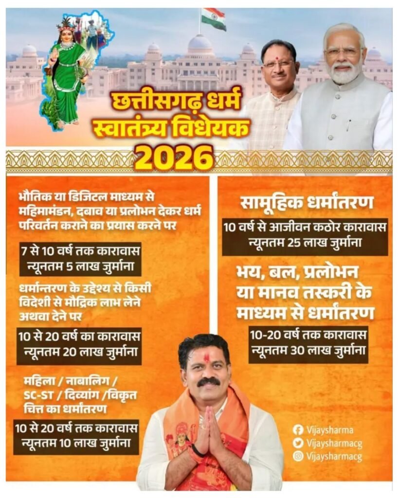 छत्तीसगढ़ में इस महत्वपूर्ण विधेयक के पारित होने से सेवा के नाम पर धर्मान्तरण और कन्वर्शन जैसी राष्ट्र विरोधी गतिविधियों पर प्रभावी अंकुश लगेगा । छत्तीसगढ़ में बड़े पैमाने पर लंबे समय से ग़रीब, आदिवासी, वनवासी और पिछड़े तबके के लोगो के धर्मांतरण राष्ट्र विरोधी तत्वों द्वारा किया जा रहा था । सेवा के नाम पर किया जा रहे धर्मांतरण पर इस विधेयक के पारित होने से अंकुश लगेगा । धर्मांतरण में संलिप्त लोगो पर आपराधिक धराओ के तहत कार्यवाही सुनिश्चित होगी, साथ ही सेवा के नाम पर शोषित हो रहें लोगो की रक्षा होगी। इसलिए इस महत्वपूर्ण विधेयक के पारित होने पर भाजपा झुग्गी झोपड़ी प्रकोष्ठ प्रदेश के गृहमंत्री श्री विजय शर्मा एवं मुख्यमंत्री श्री विष्णु देव साय जी का आभार व्यक्त करती है ।