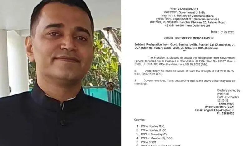 रायपुर, 04 जुलाई। Resignation of IAS : भारतीय डाक एवं दूरसंचार लेखा तथा वित्त सेवा (Indian P&T Accounts and Finance Service – IP&TAFS) के 2009 बैच के अधिकारी पोषण चंद्राकर का इस्तीफा आखिरकार मंजूर कर लिया गया है। उन्होंने जुलाई 2024 में अपने पद से इस्तीफा दिया था, जिसे अब केंद्र सरकार ने औपचारिक रूप से स्वीकृति दे दी है।