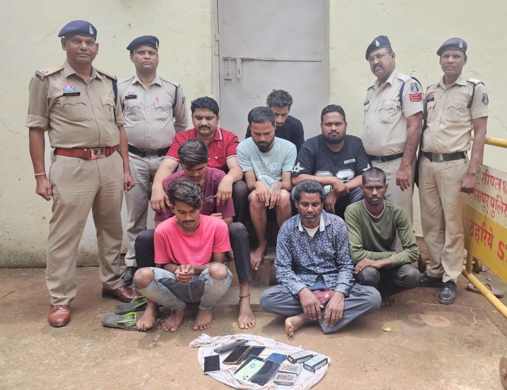 सूचना पर सीपत पुलिस द्वारा टिम तैयार कर नहर के पास लुतरा में चारो ओर से सुनियोजित तरिको से घेरा बंदी करते हुये 08 जुआडियो को 52 पत्ती ताश से रंगे हाथ जुआ खेलते हुए पकडे ।