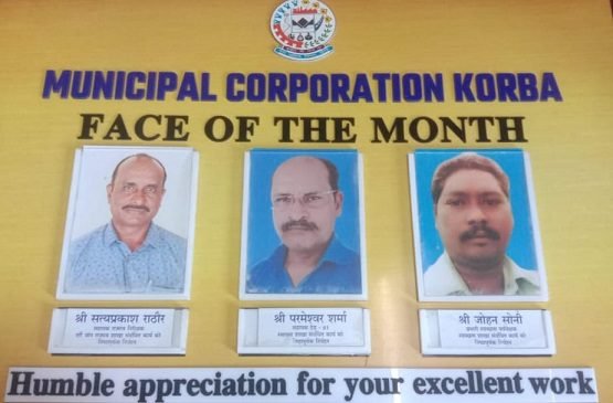 कोरबा ,10 दिसंबर । नगर पालिक निगम कोरबा के सहायक राजस्व निरीक्षक सत्य प्रकाश राठौर, सहायक ग्रेड lll परमेश्वर शर्मा एवं स्वच्छता निरीक्षक जोहन सोनी को दिसम्बर माह का ’’ फेस आफ द मंथ ’’ चुना गया है। महापौर श्रीमती संजूदेवी राजपूत व आयुक्त आशुतोष पाण्डेय ने ’’ फेस आफ द मंथ ’’ चुने गए इन कर्मचारियों को बधाई दी है तथा कार्य के प्रति उनकी निष्ठा की सराहना की है।