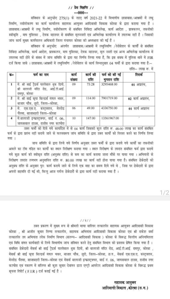 कोरबा। संविधान के अनुच्छेद 275(1) के तहत वर्ष 2021-22 में विभागीय छात्रावास/आश्रयों में लघु निर्माण और नवीनीकरण कार्यों में गंभीर अनियमितताओं का मामला सामने आया है। आदिवासी विकास कोष से हुए इन कार्यों में नियम विरुद्ध भुगतान और कार्य अधूरे छोड़ने के आरोप में विभाग ने जांच कर चार ठेकेदारों के खिलाफ पुलिस में एफआईआर दर्ज कराई है।