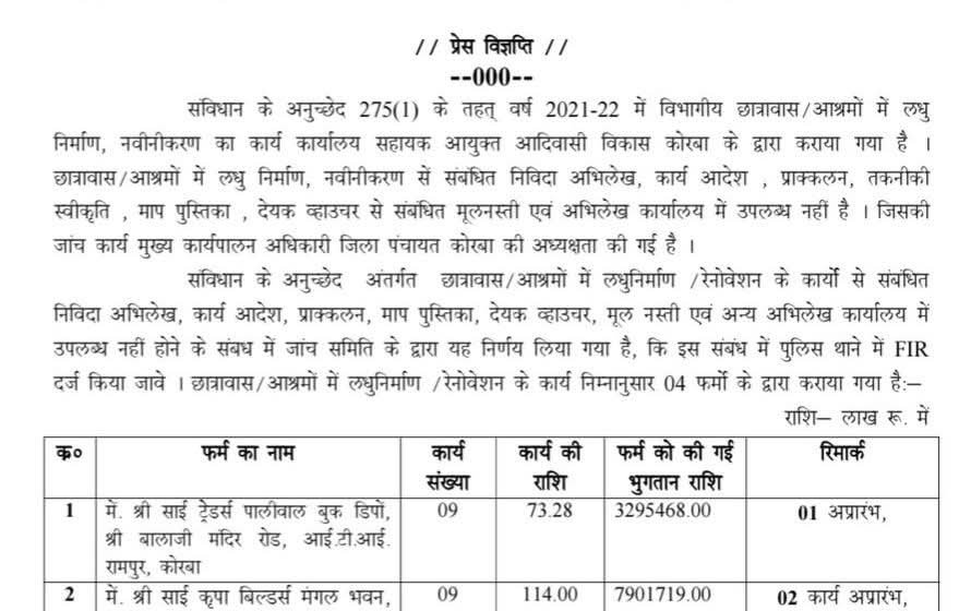 कोरबा। संविधान के अनुच्छेद 275(1) के तहत वर्ष 2021-22 में विभागीय छात्रावास/आश्रयों में लघु निर्माण और नवीनीकरण कार्यों में गंभीर अनियमितताओं का मामला सामने आया है। आदिवासी विकास कोष से हुए इन कार्यों में नियम विरुद्ध भुगतान और कार्य अधूरे छोड़ने के आरोप में विभाग ने जांच कर चार ठेकेदारों के खिलाफ पुलिस में एफआईआर दर्ज कराई है।