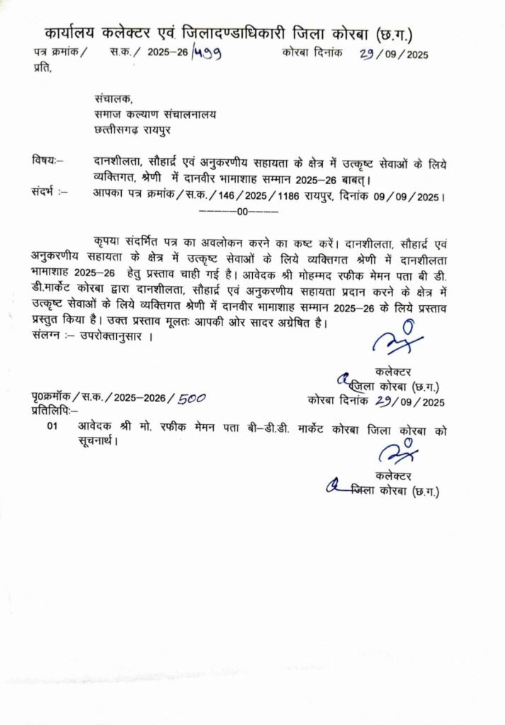 कोरबा । जिले के लिए यह अत्यंत गौरव और हर्ष का विषय है कि जिले के वरिष्ठ जीएसटी सलाहकार एवं योजनाकार मोहम्मद रफीक मेमन का नाम प्रतिष्ठित “छत्तीसगढ़ राज्य अलंकरण 2024-25” हेतु अनुशंसित किया गया है। माननीय कलेक्टर महोदय कोरबा ने उनके नाम के प्रस्ताव को अनुमोदित कर संचालक, समाज कल्याण संचालनालय रायपुर को प्रेषित कर दिया है।श्री मेमन न केवल एक कुशल जीएसटी सलाहकार और योजनाकार हैं, बल्कि वे समाज सेवा और गरीबों की मदद के क्षेत्र में भी निरंतर सक्रिय रहते हैं। उनकी मानवीय संवेदनाएँ और सेवाभाव ने उन्हें जिले और प्रदेश में अलग पहचान दिलाई है।