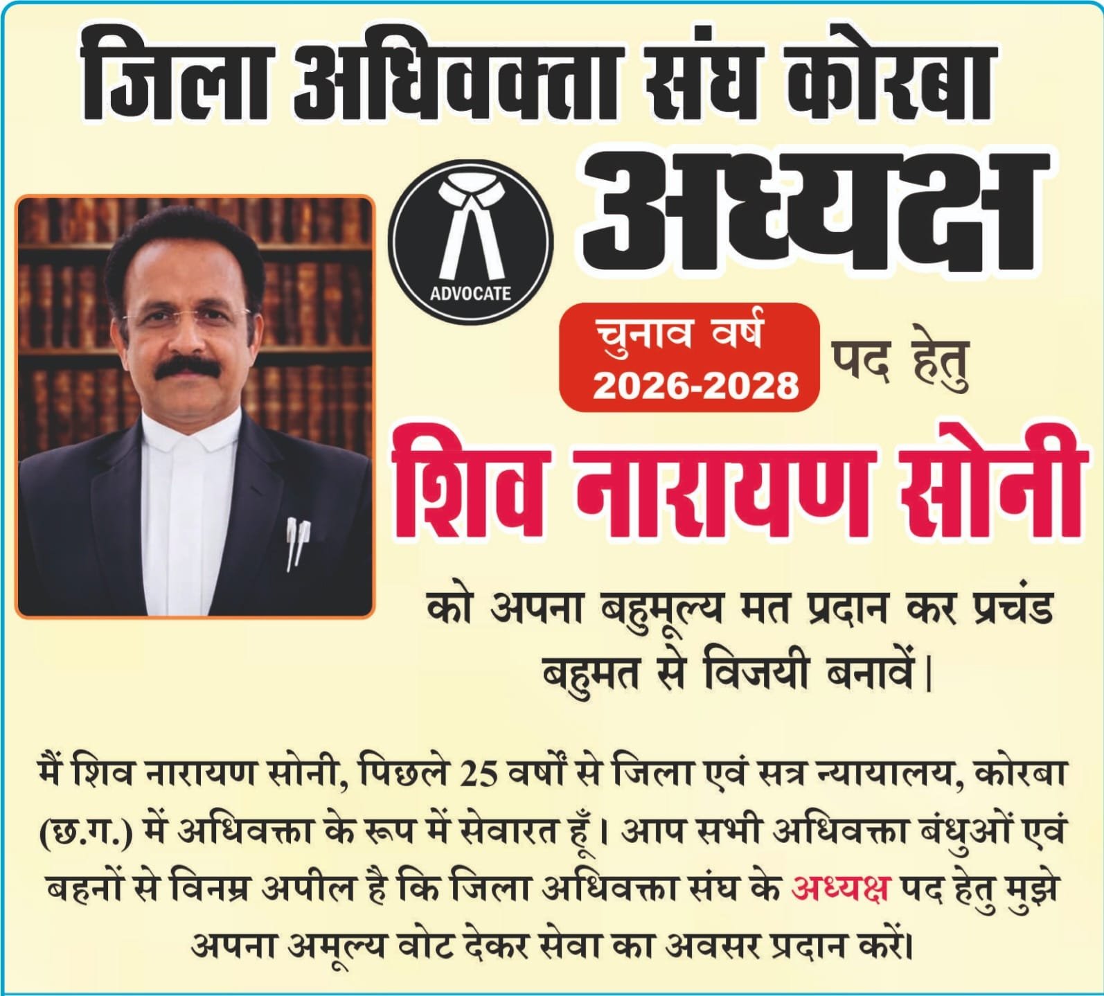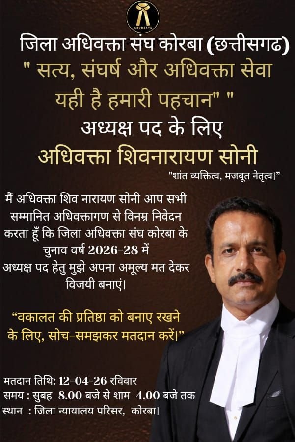करीब 25 वर्षों से जिला एवं सत्र न्यायालय, कोरबा में वकालत कर रहे शिव नारायण सोनी ने अपने अनुभव और सेवा भाव के आधार पर अधिवक्ताओं से समर्थन की अपील की है। उन्होंने कहा कि “सत्य, संघर्ष और अधिवक्ता सेवा” ही उनकी पहचान है और वे अधिवक्ताओं के हितों की रक्षा के लिए प्रतिबद्ध हैं।