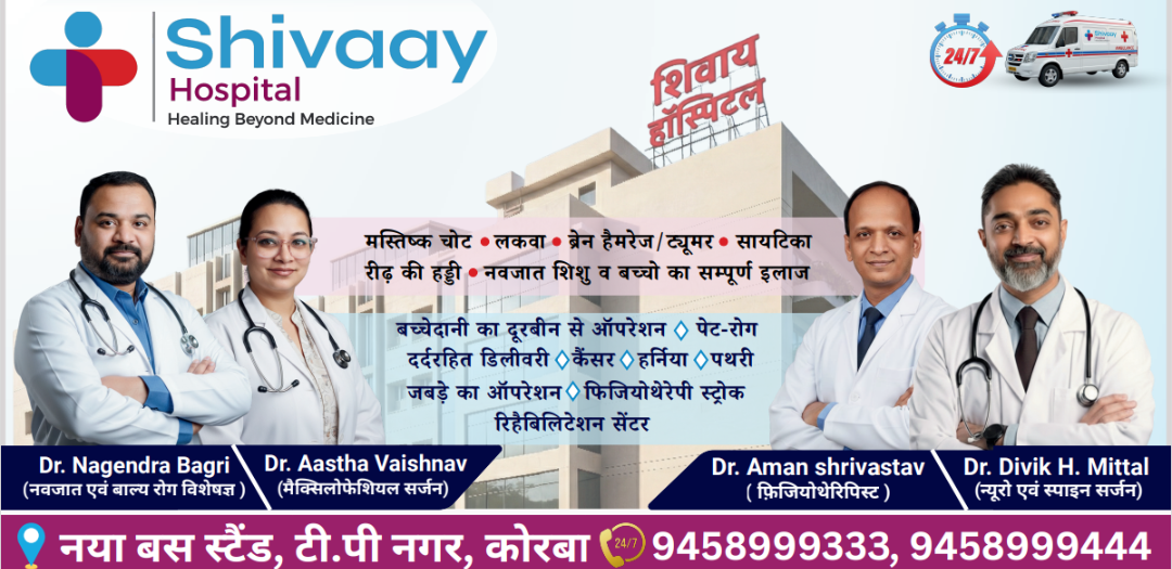 कोरबा। शहर के नया बस स्टैंड, टी.पी. नगर में शिवाय हॉस्पिटल की शुरुआत की गई है, जहां मरीजों को आधुनिक सुविधाओं के साथ विभिन्न प्रकार की बीमारियों का उपचार उपलब्ध कराया जाएगा। अस्पताल में अनुभवी डॉक्टरों की टीम द्वारा मरीजों का इलाज किया जाएगा तथा 24×7 आपातकालीन सेवा भी उपलब्ध रहेगी।